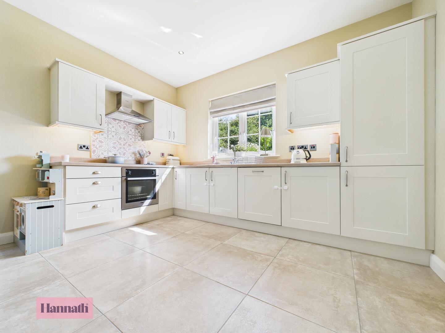 Range of high and low level units, integrated appliances, tiled flooring, radiator