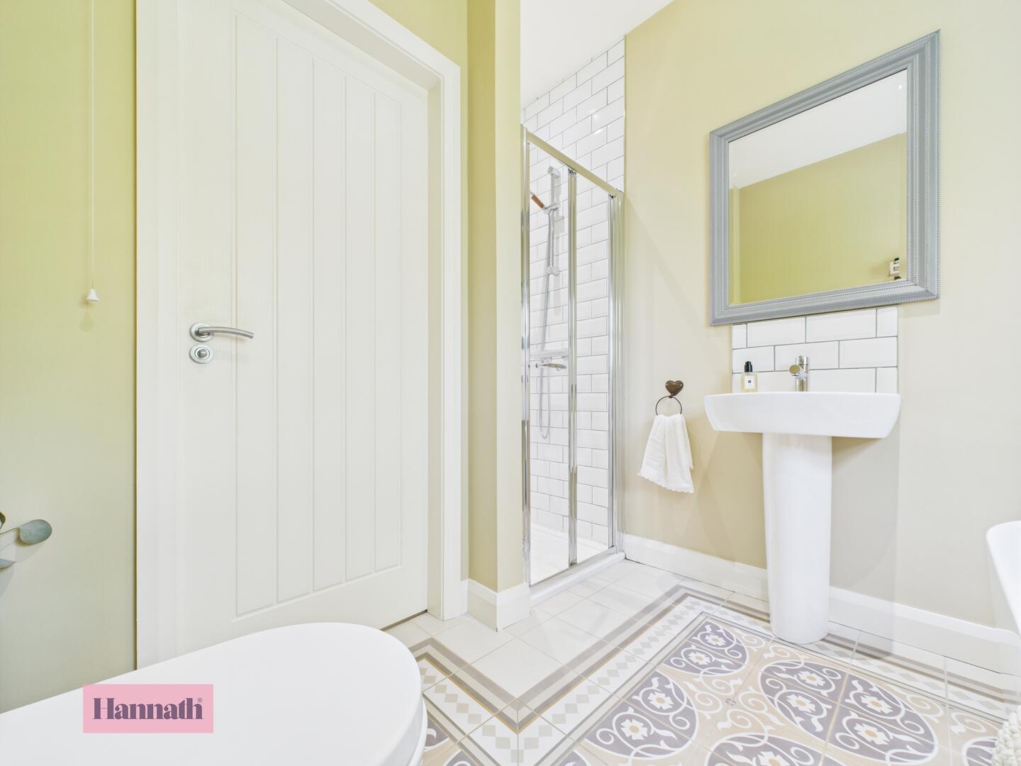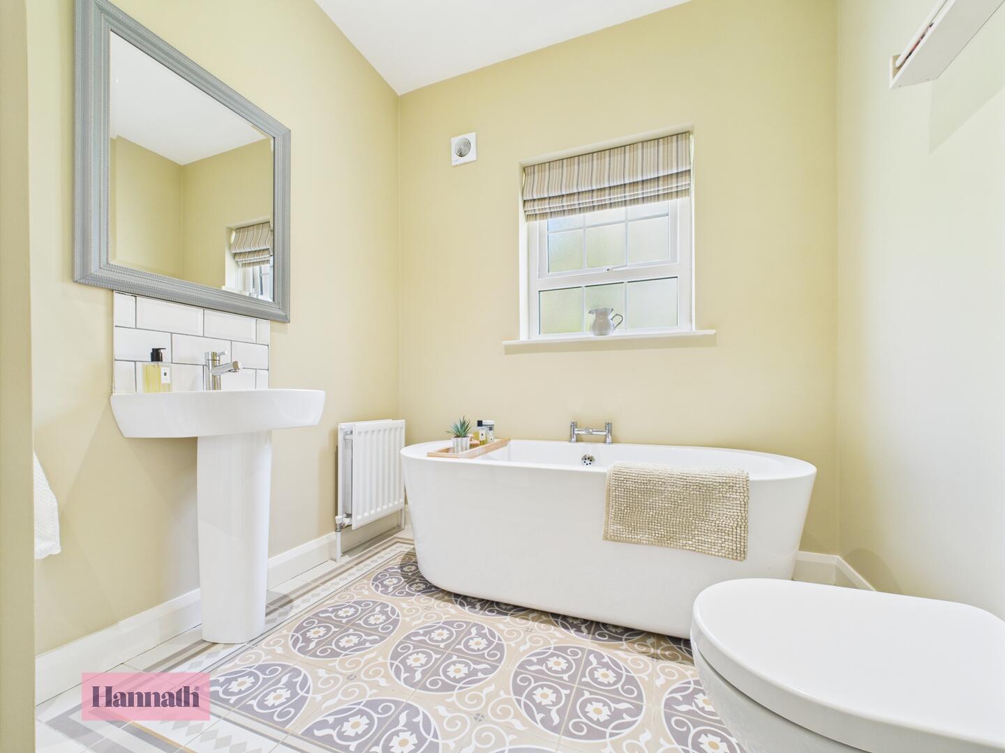 Four piece suite, shower cubicle, stand alone bath, wash hand basin, w.c., tiled flooring, radiator