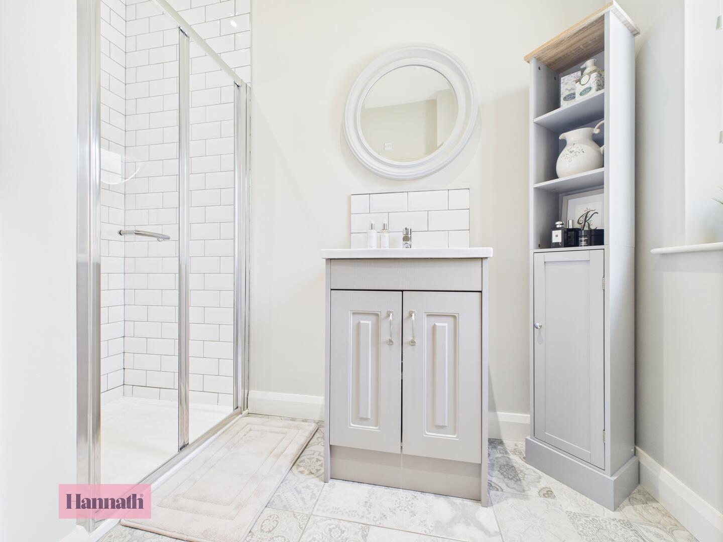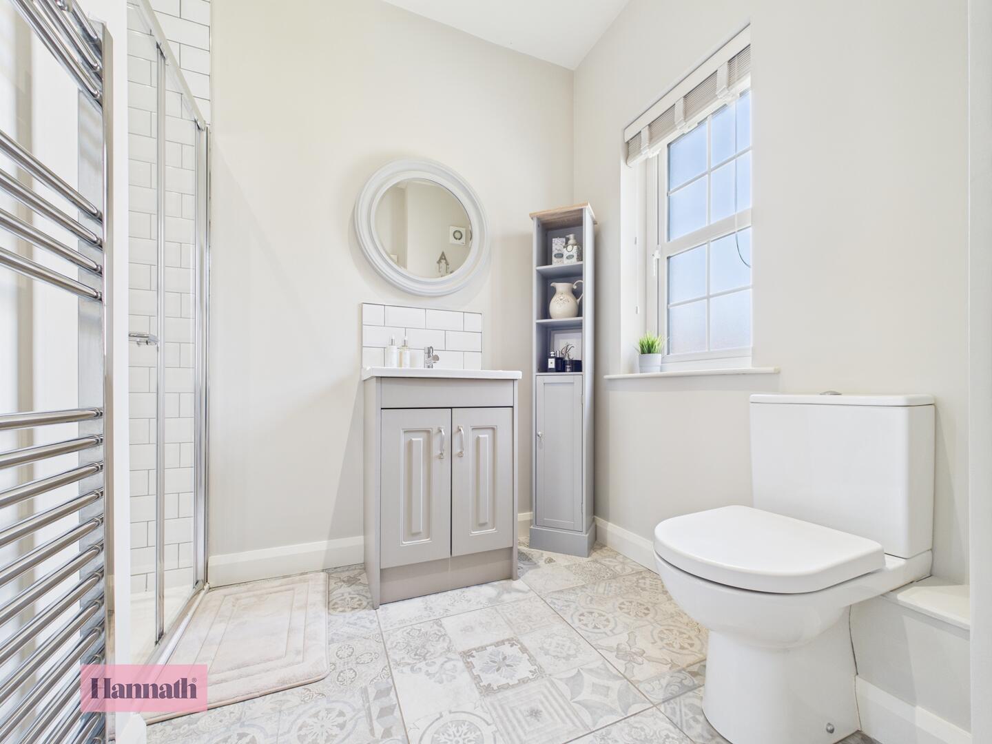 Three piece suite, shower cubicle, wash hand basin, w.c., tiled flooring, heated towel rail