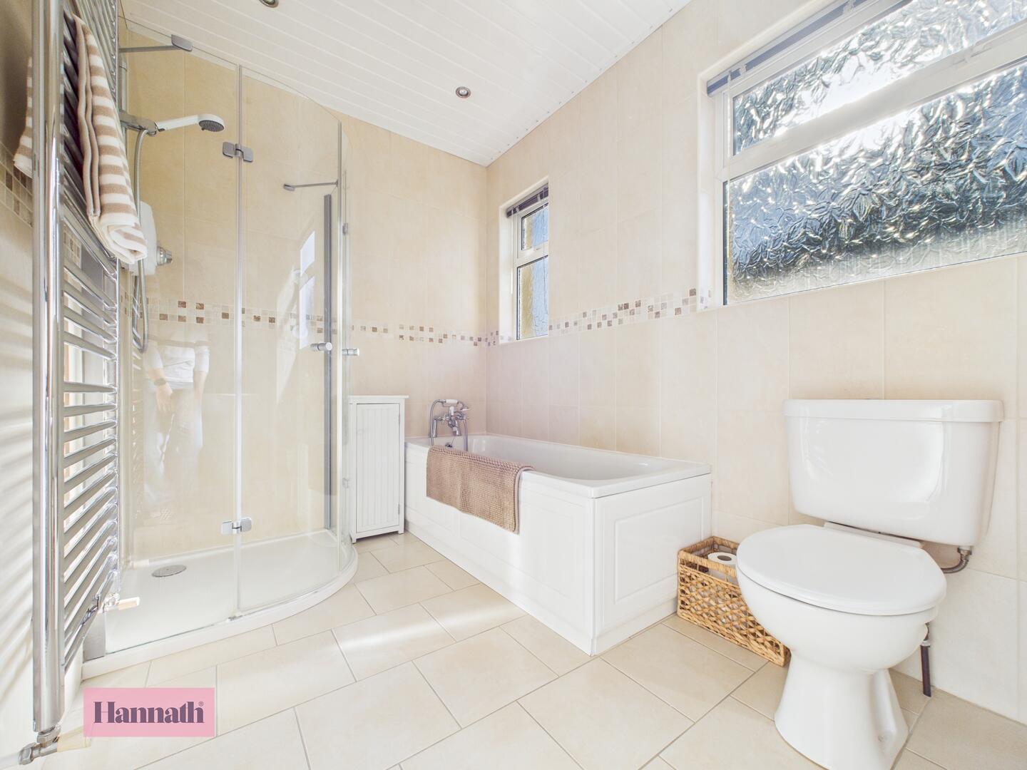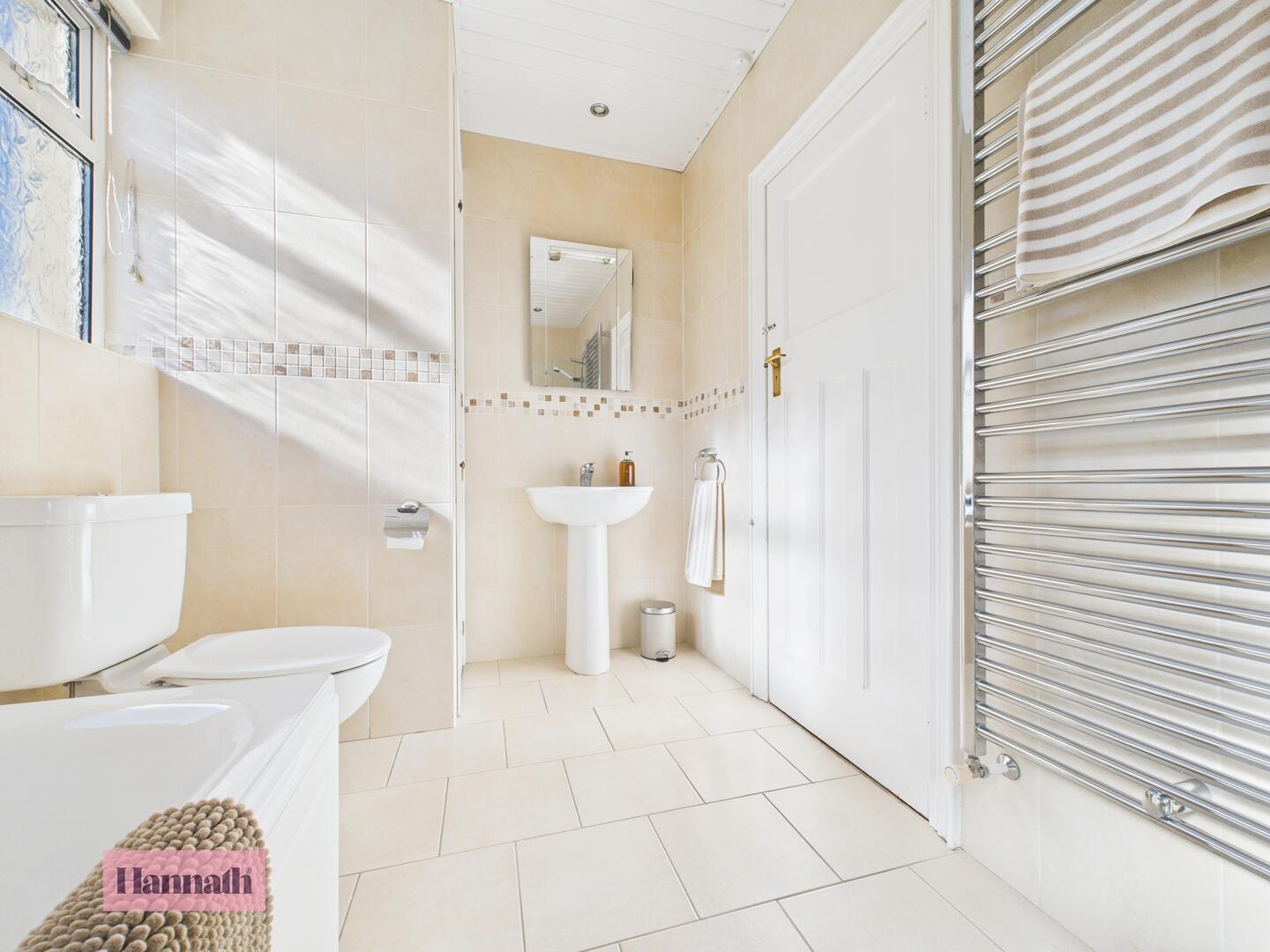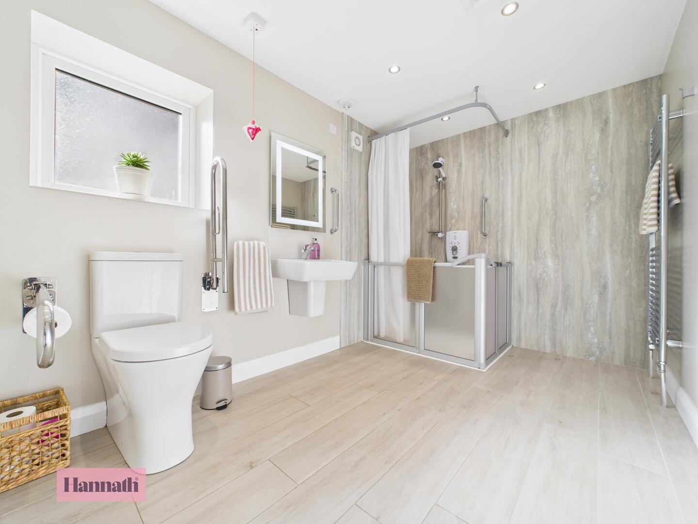 Comprising of; low flush WC, wash hand basin and shower with electric unit. Wood effect flooring. Panelled shower enclosure. Double panel radiator.