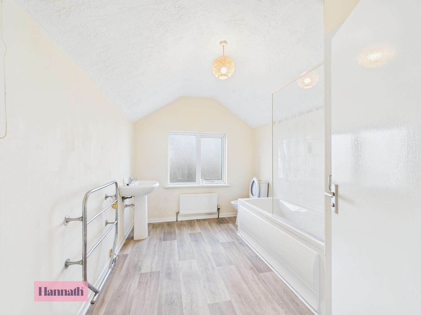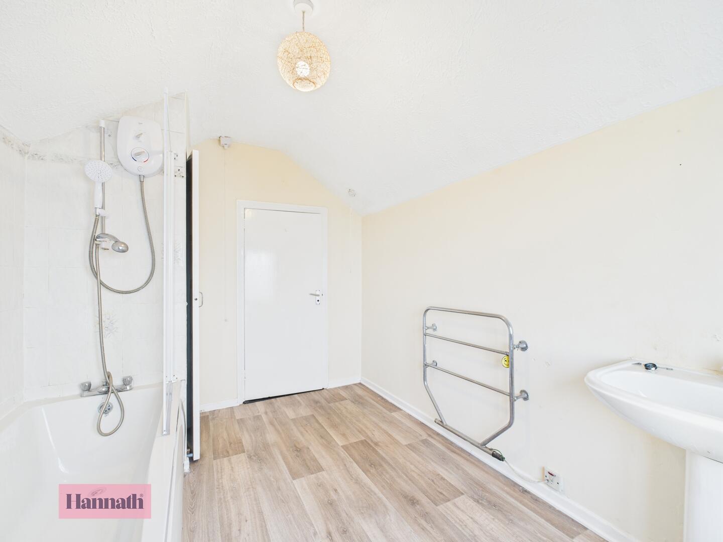 Three piece bathroom suite with electric shower over bath, wash hand basin, w.c., radiator, part tiled wall