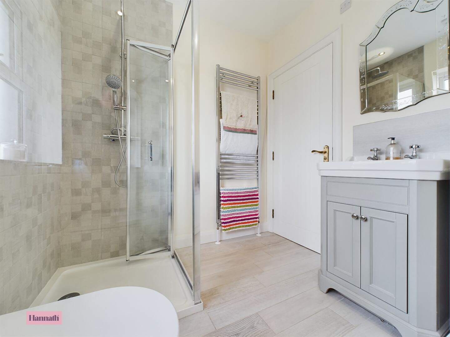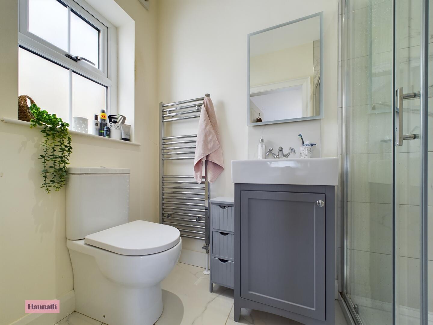 Three piece suite comprising of; low flush WC, wash hand basin with vanity unit and mains shower. Tiled flooring, splash back and shower enclosure. Heated towel rail.