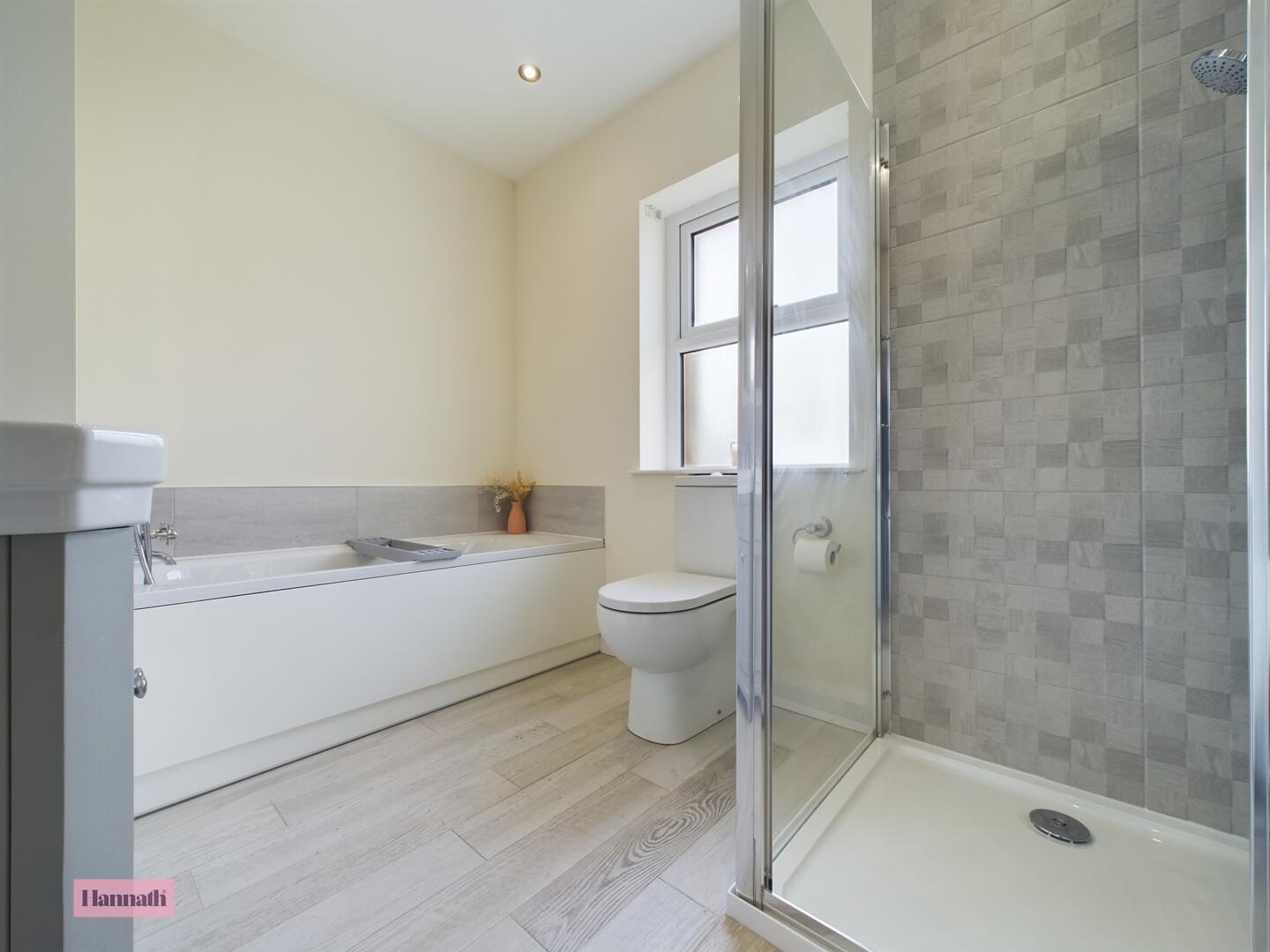 Four piece bathroom suite comprising of; low flush WC, wash hand basin with vanity unit, fitted bath and mains shower. Tiled flooring, splash back and shower enclosure. Heated towel rail.