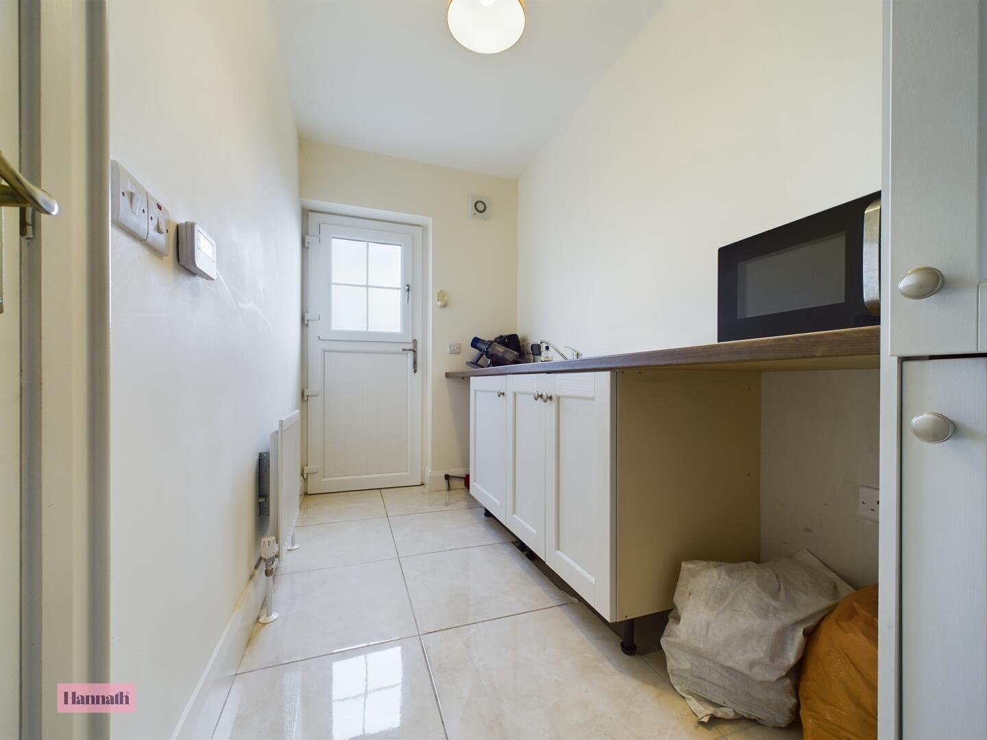 High and low level fitted units with hard wearing worktop and stainless steel sink. Plumbed for washing machine and space for tumble dryer. Tiled flooring. Single panel radiator. Access to rear garden via; PVC door.