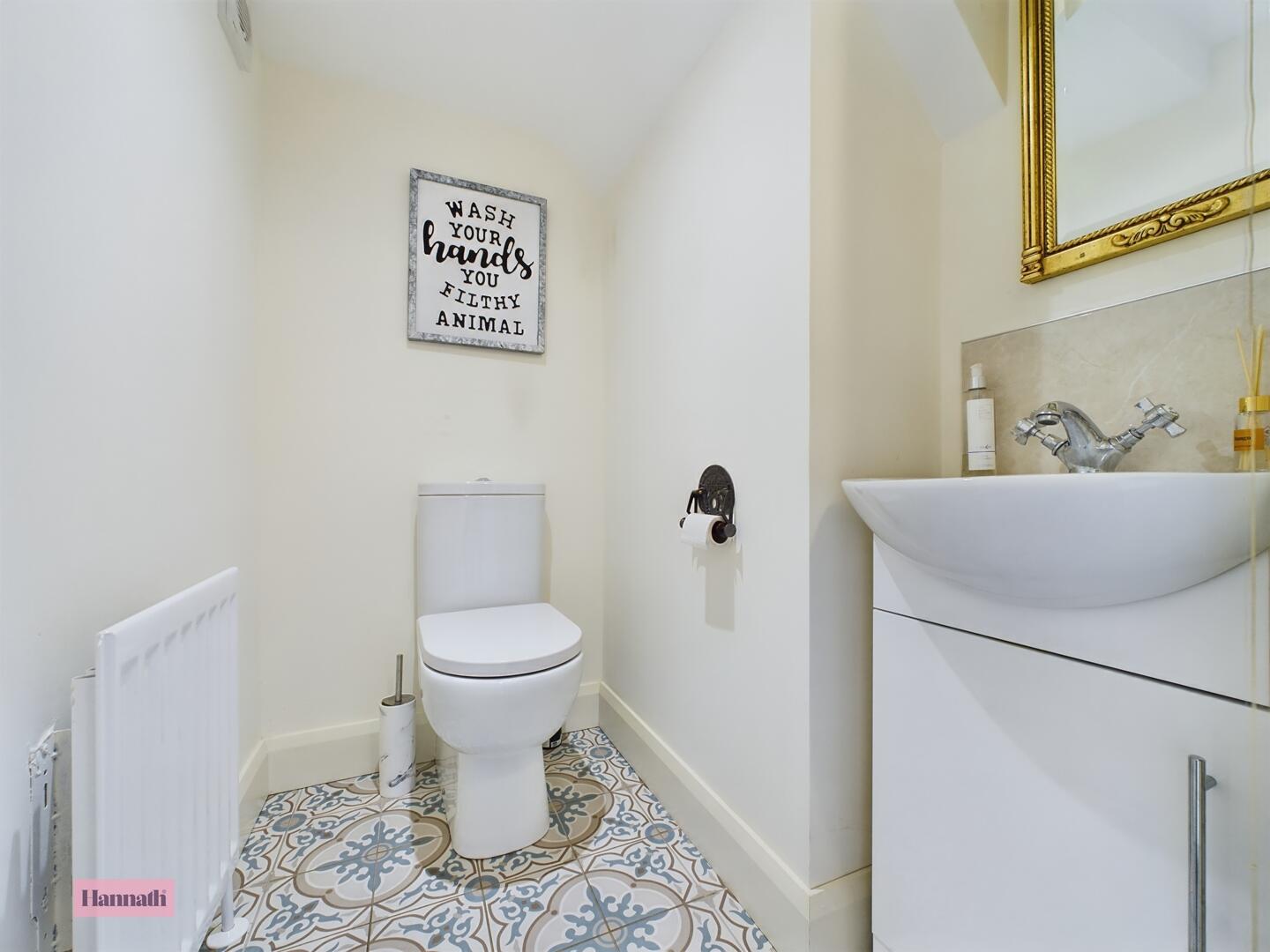 Comprising of; low flush WC and wash hand basin with vanity unit. Tiled flooring and splash back. Single panel radiator.