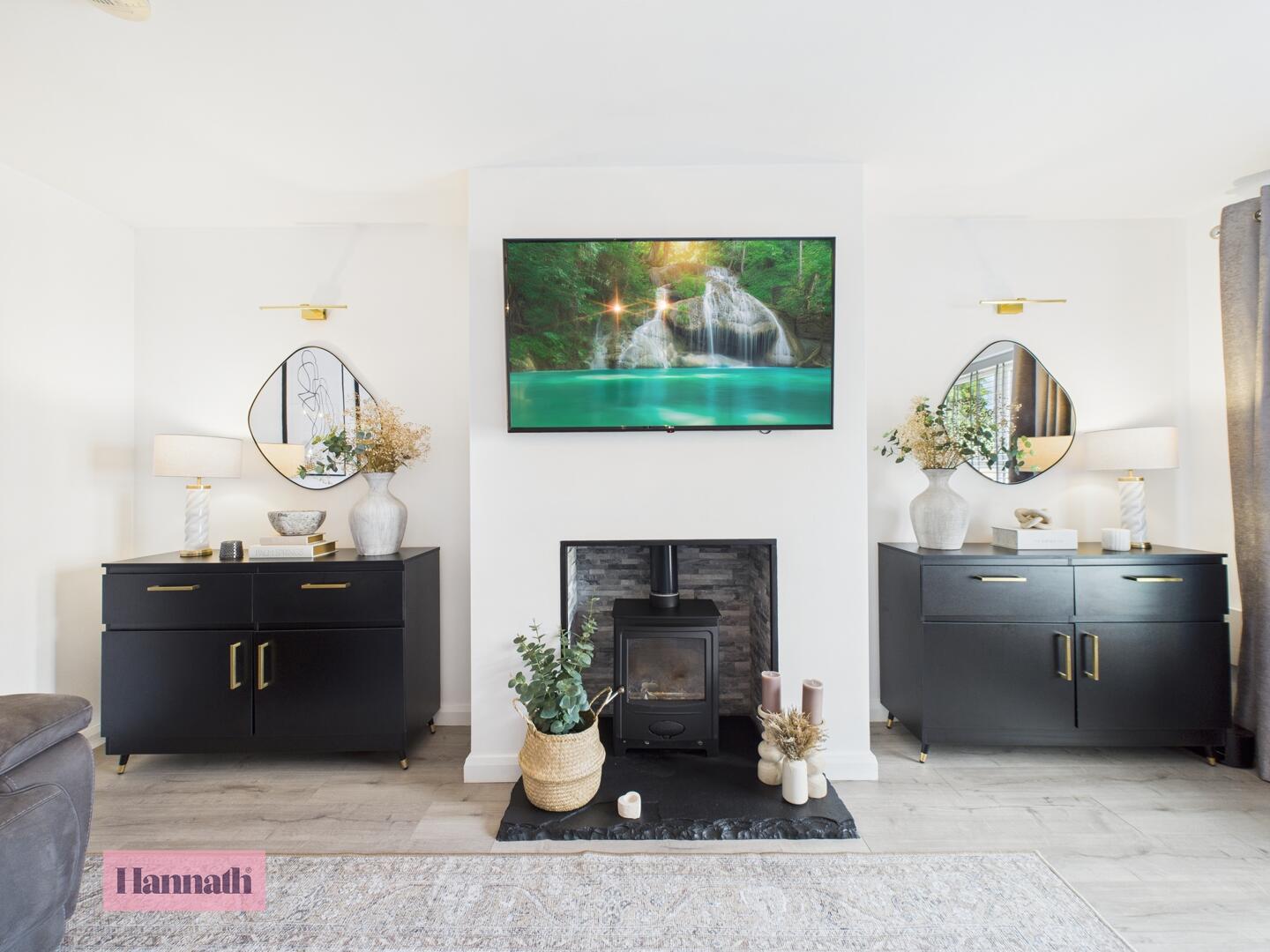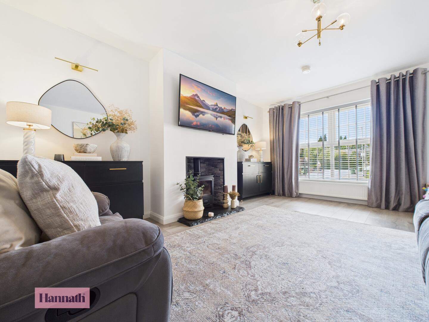 Wood effect laminate flooring. Double panel radiator. Multi fuel stove with slate hearth.