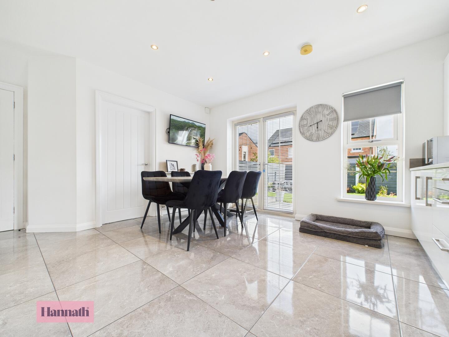 Range of high and low level fitted units with hard wearing worktop and upstand, stainless steel 1.5 sink with mixer tap. Integrated gas hob, oven, extractor fan, dishwasher and fridge/freezer. Access to under stairs storage. Double panel radiator. Tiled flooring. Access to rear garden via; PVC double doors.