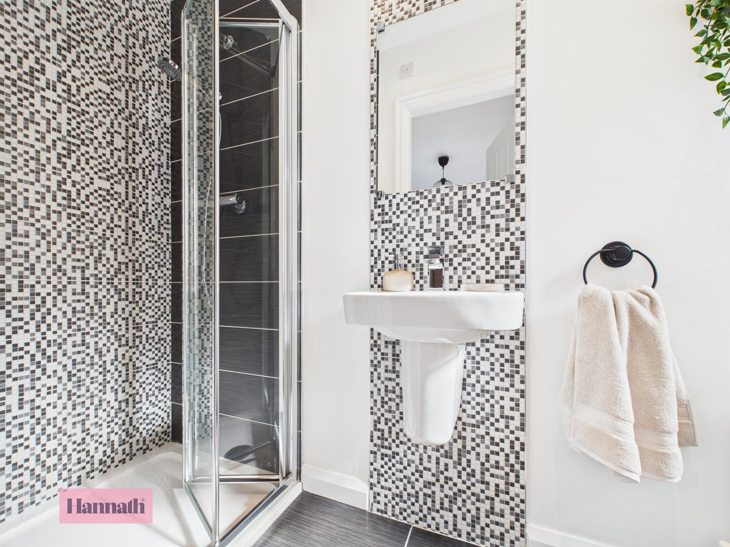 Three piece suite comprising of; low flush WC, wash hand basin and mains shower with dual drencher shower head. Tiled flooring, splash back and shower enclosure. Single panel radiator.