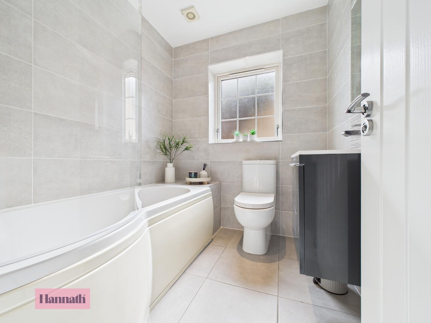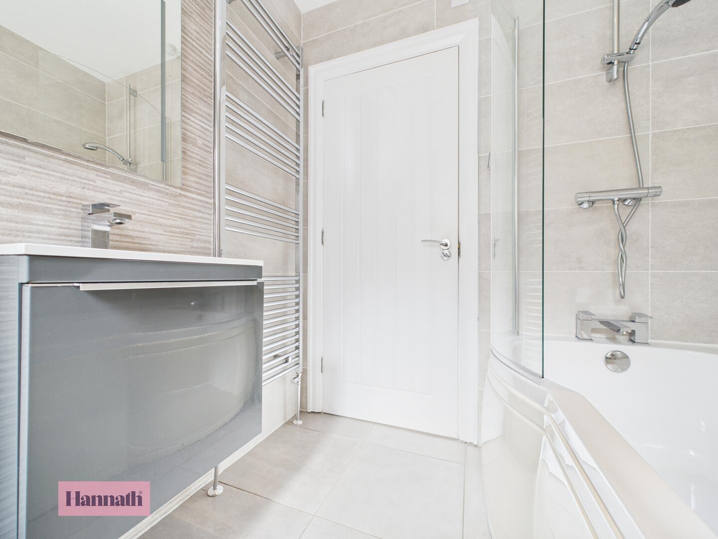 Three piece suite comprising of; low flush WC, wash hand basin with vanity unit and fitted bath with mains shower. Heated towel rail. Fully tiled walls and tiled flooring.