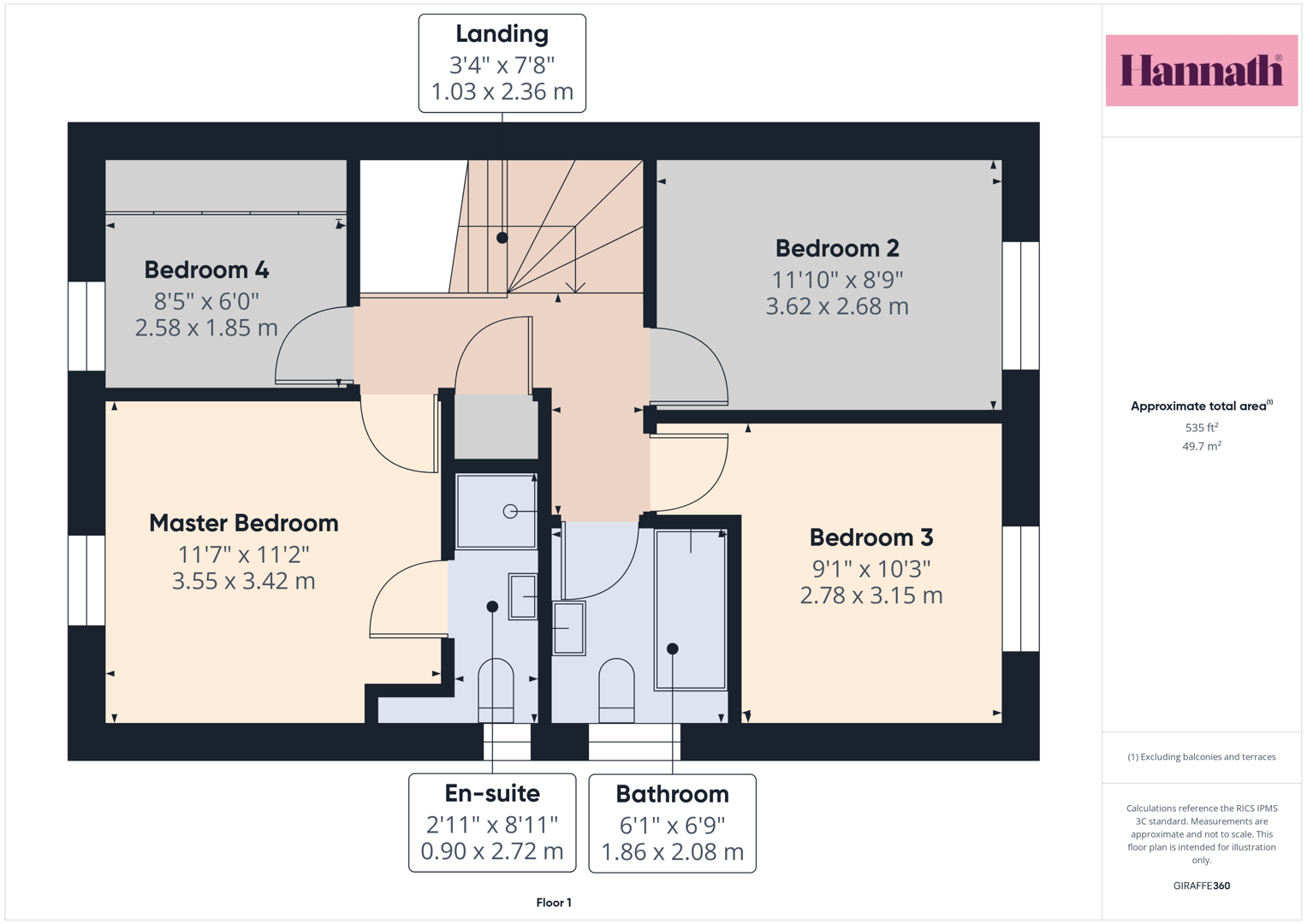 Landing 3'4 X 7'8 (1.02m X 2.34m)