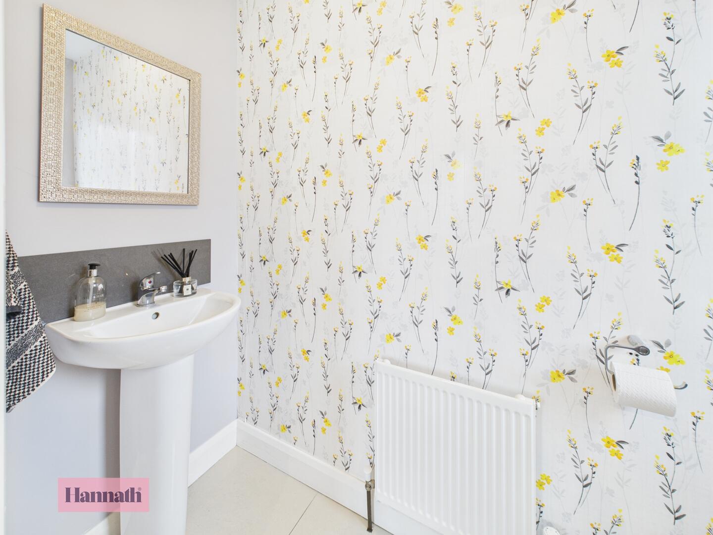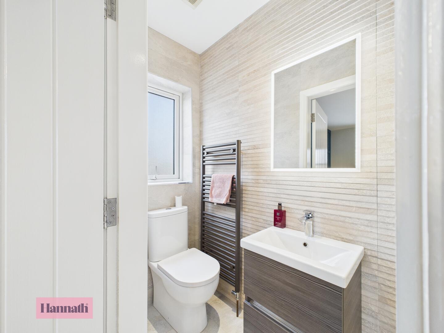 Wash hand basin, w.c., tiled flooring, radiator