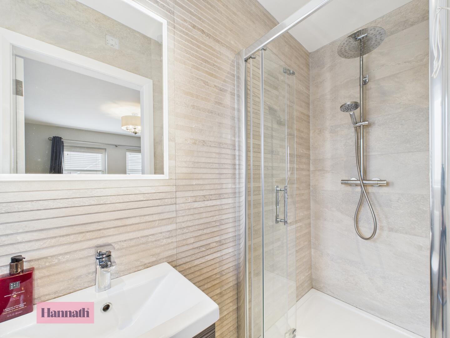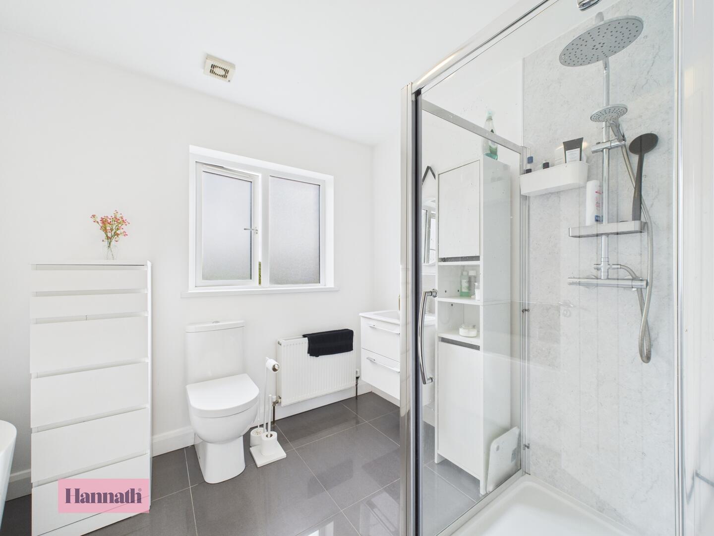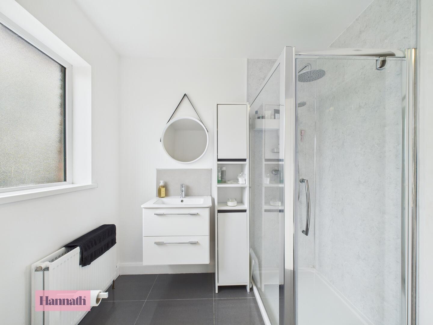 Three piece piece suite, shower cubicle, wash hand basin, w.c., heated towel rail, tiled walls and tiled floor