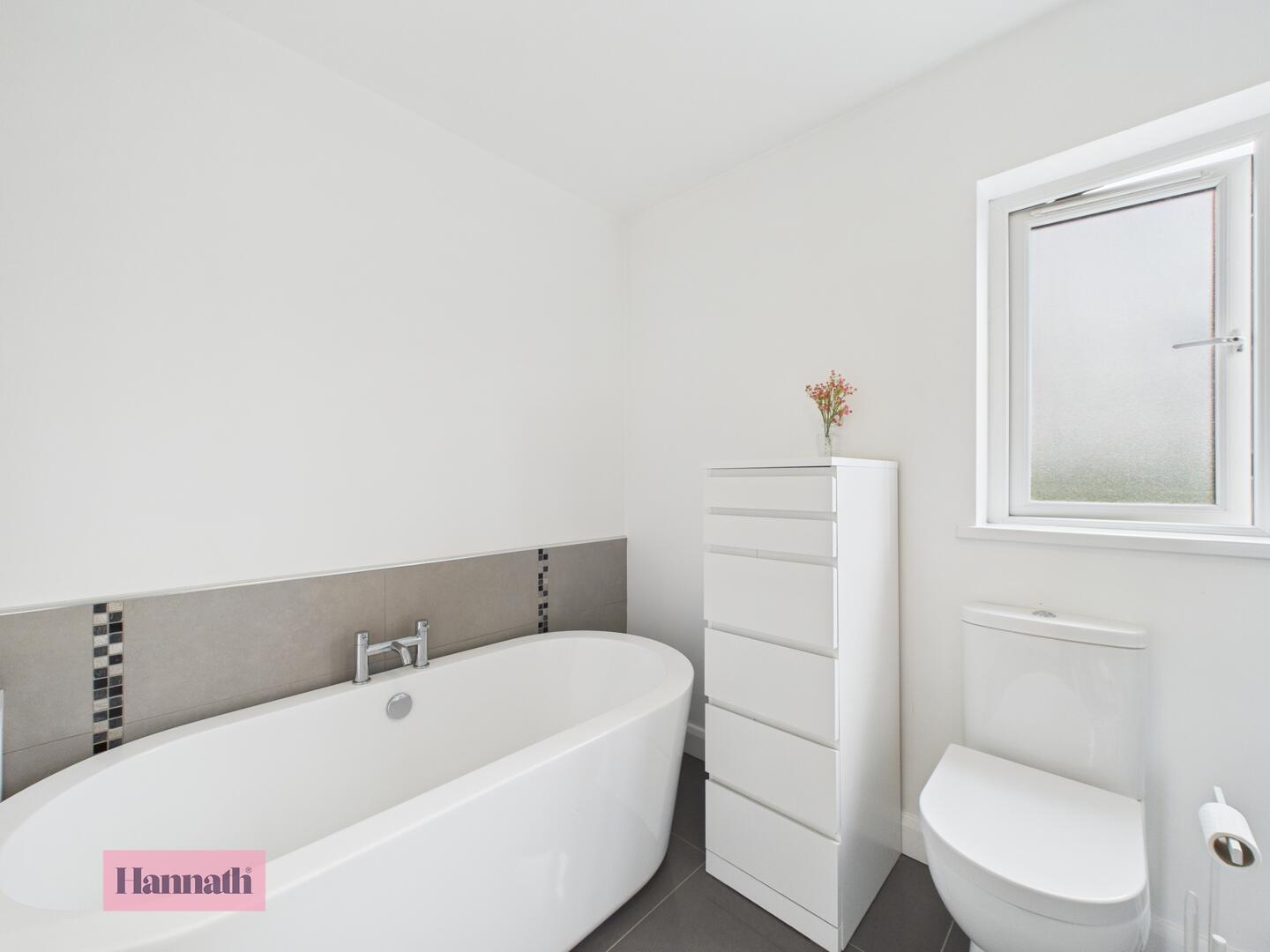 Four piece bathroom, mains shower cubicle, stand alone bath, wash hand basin, w.c., tiled floor, radiator