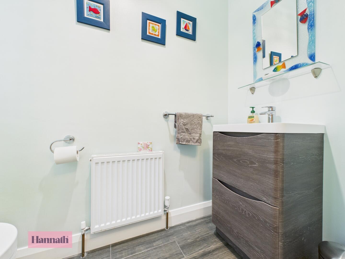 Four piece bathroom suite comprising of; low flush WC, wash hand basin, fitted bath and mains shower. Tiled flooring, splash back and shower enclosure. Heated towel rail.