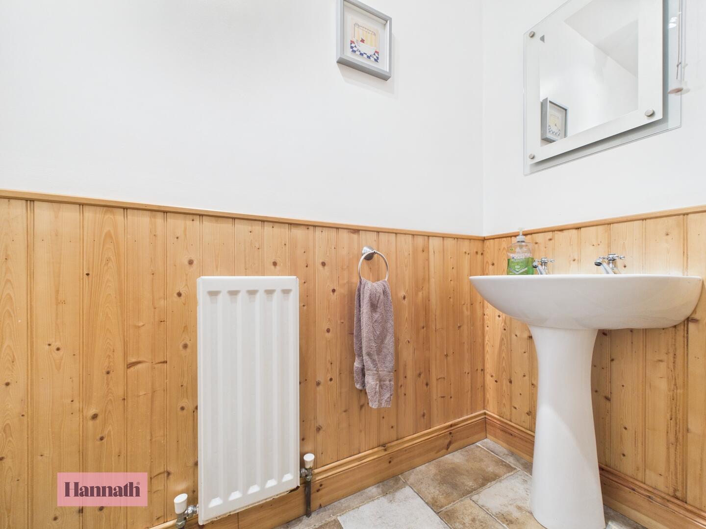 Low flush WC, pedestal wash hand basin, tiled floor & wood panels