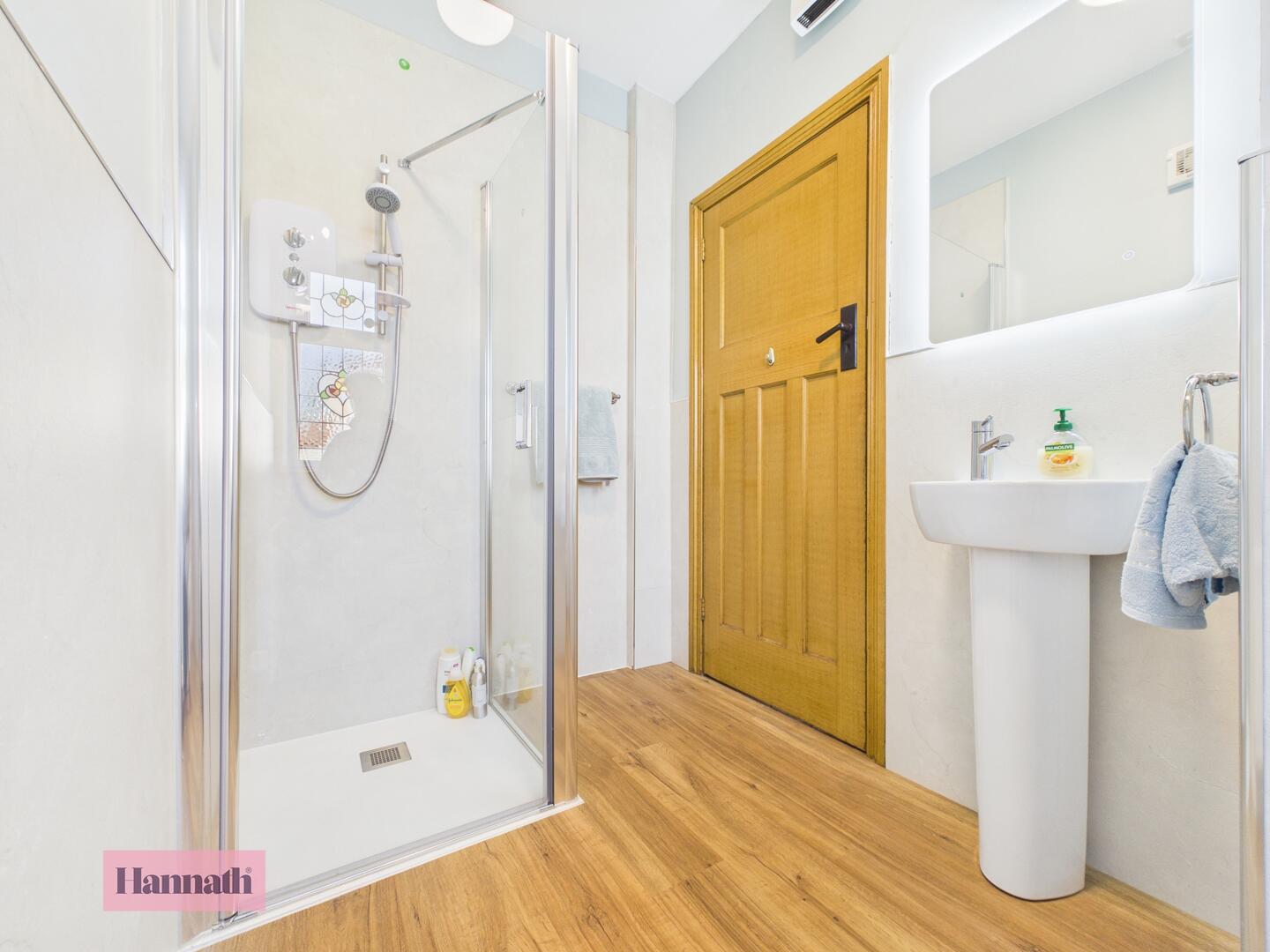 Three piece bathroom suite, electric shower cubcile, wash hand basin, w.c., radaitor, vinyl flooring