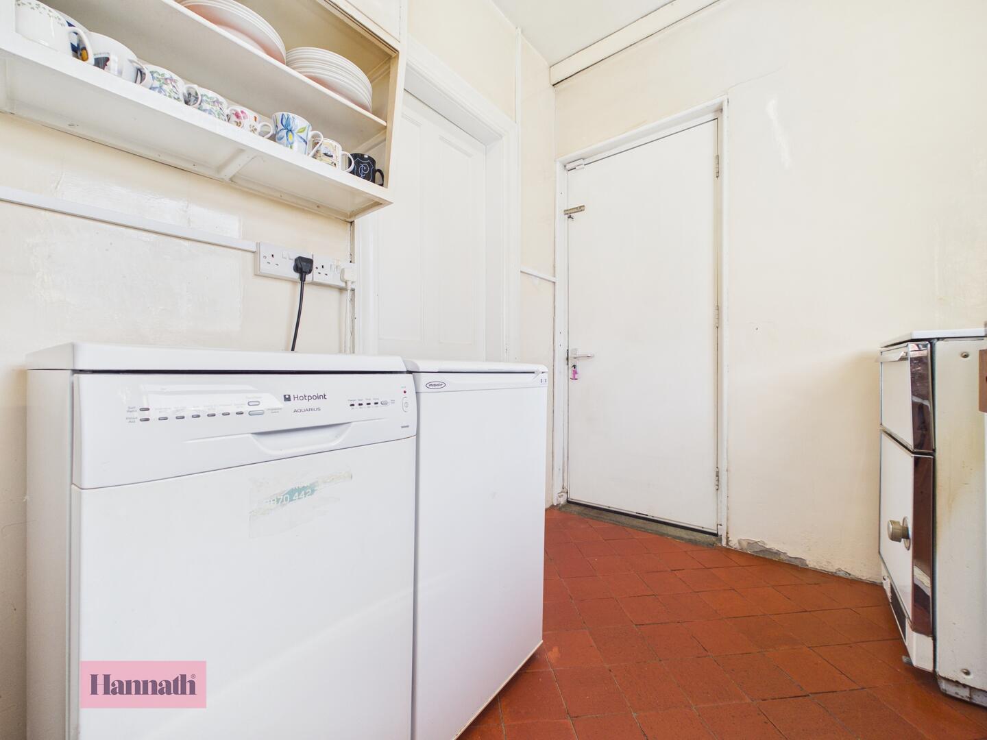 Range of high and low level units, space for oven, fridge freezer and washing machine, tiled flooring, back door to rear