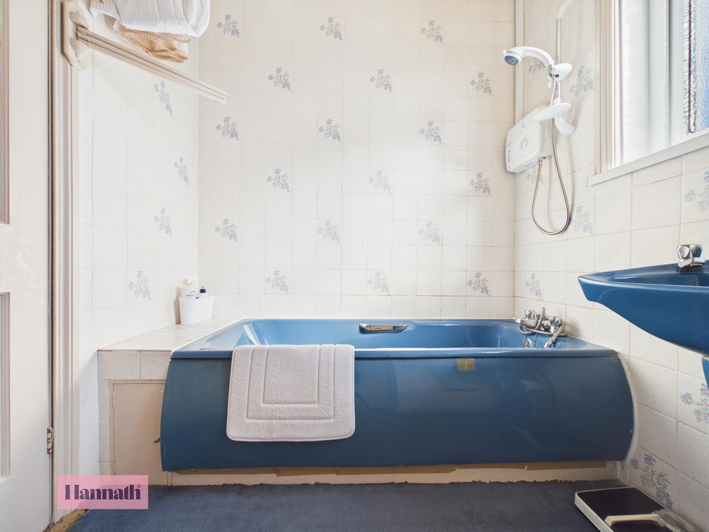 Bath, wash hand basin, radiator, carpet, tiled walls