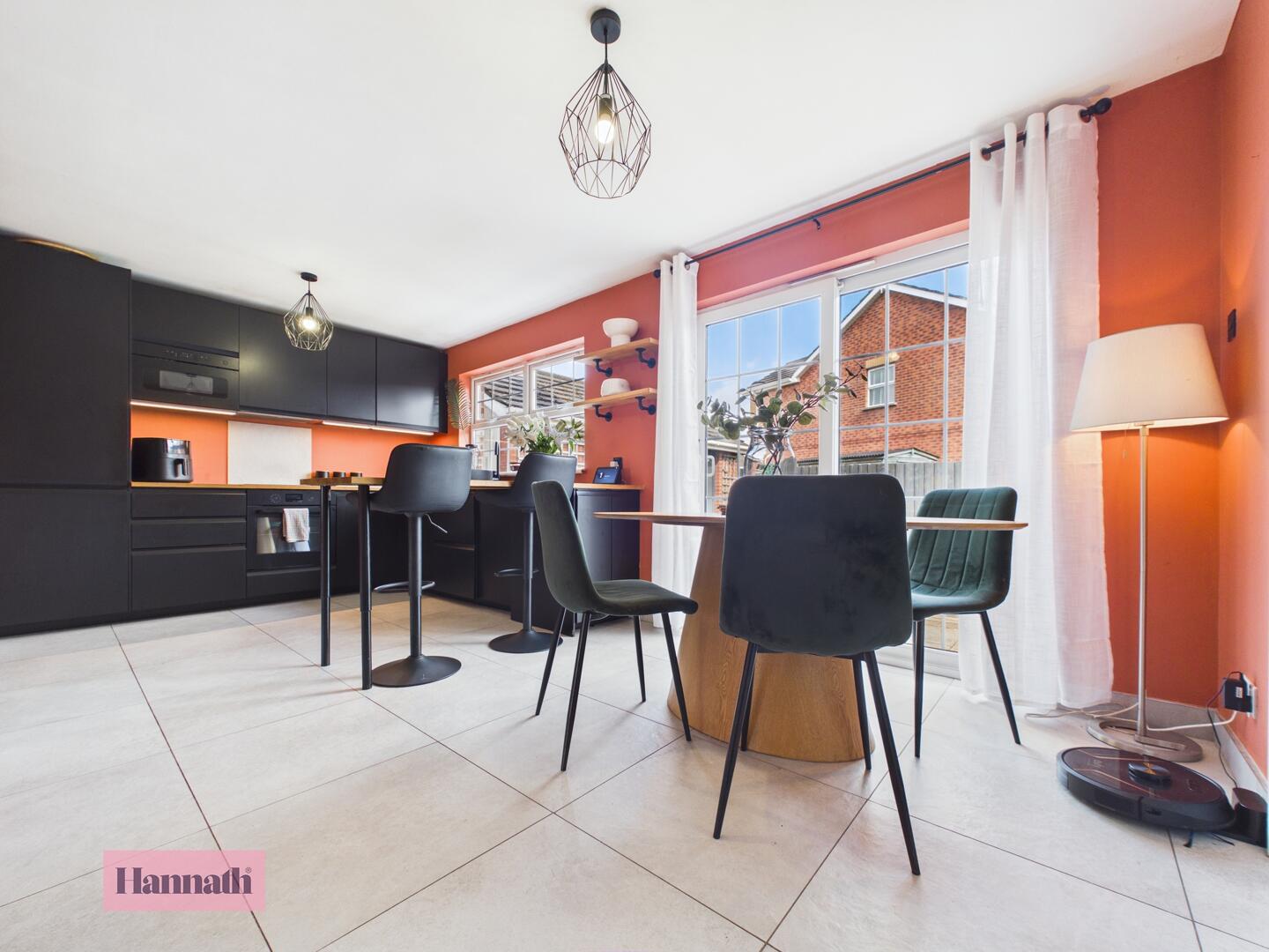 The kitchen is a standout room with vibrant terracotta walls which add warmth and personality. It features sleek black cabinetry with integrated appliances and wood-effect work surfaces. Large windows and a glass door provide ample natural light and access to the rear garden, while tiled flooring enhances the contemporary feel. A breakfast bar with seating offers a casual dining option within this well-designed kitchen space.