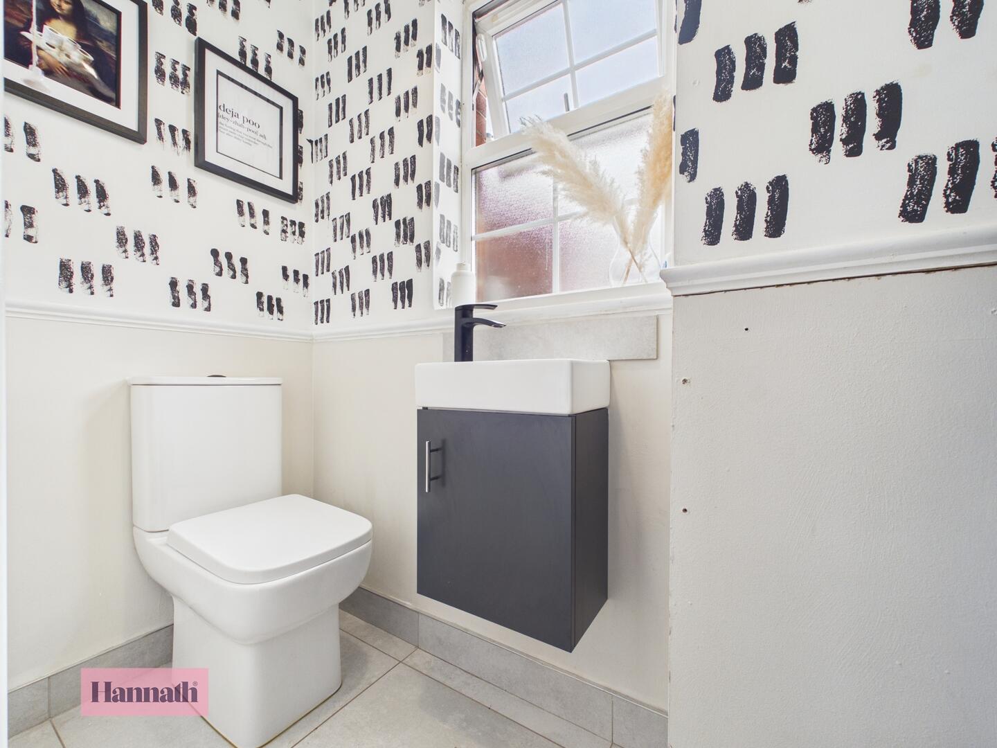 This WC is compact yet practical, featuring a modern toilet and a wall-mounted basin housed in a dark cabinet. The floor is tiled, and a frosted window ensures privacy while bringing in natural light.
