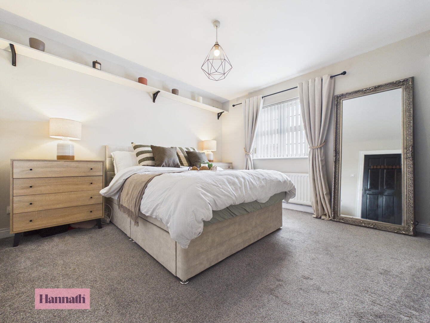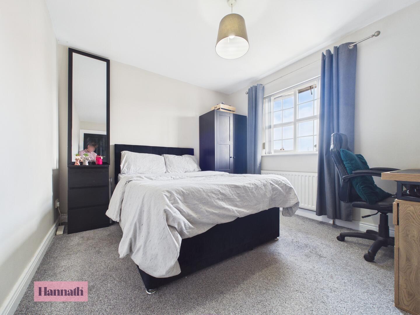 Bedroom 1 is a well-proportioned room with neutral tones and soft carpeting for comfort. A large window fills the room with natural light, and the space includes an en-suite shower room for convenience.