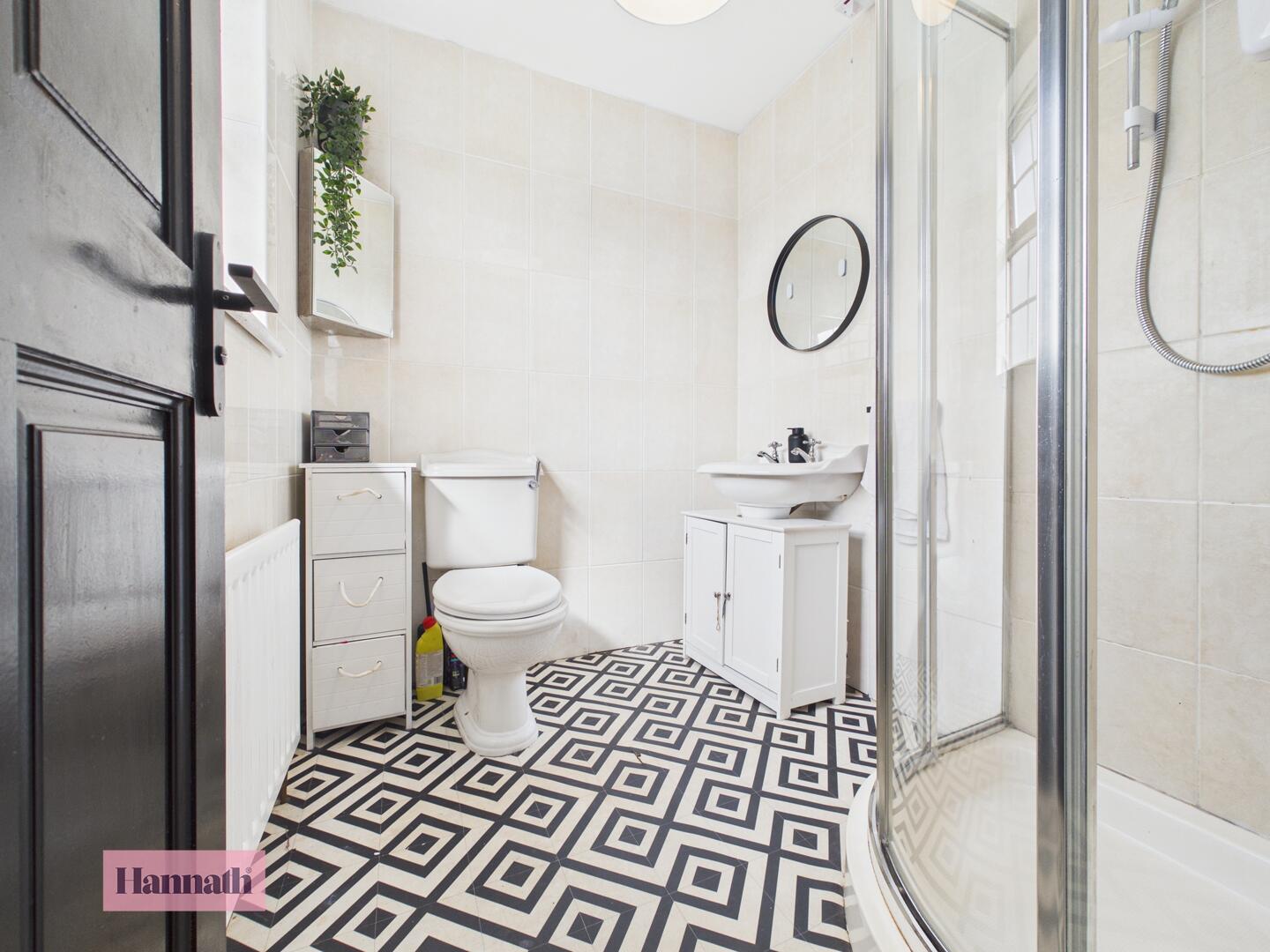 The en-suite is fitted with a modern shower, basin vanity unit, and toilet. It is practical and compact.