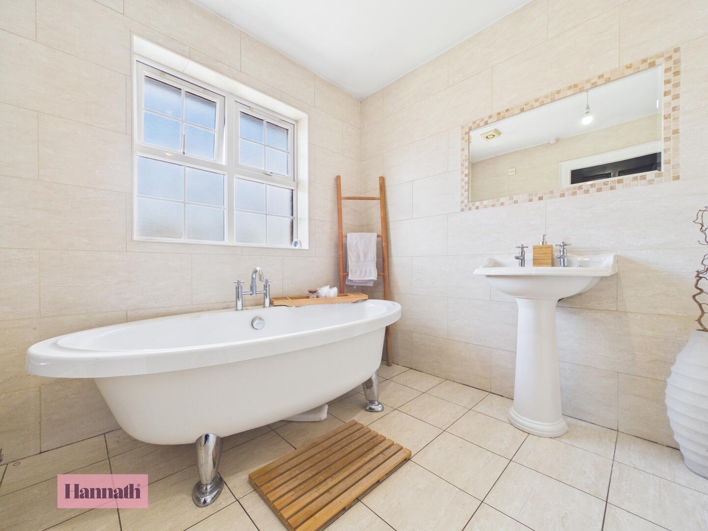 The main bathroom is spacious and bright, featuring a freestanding clawfoot bath, a separate walk-in shower, pedestal basin, and toilet. The walls and floor are tiled in neutral shades, creating a clean and relaxing space.
