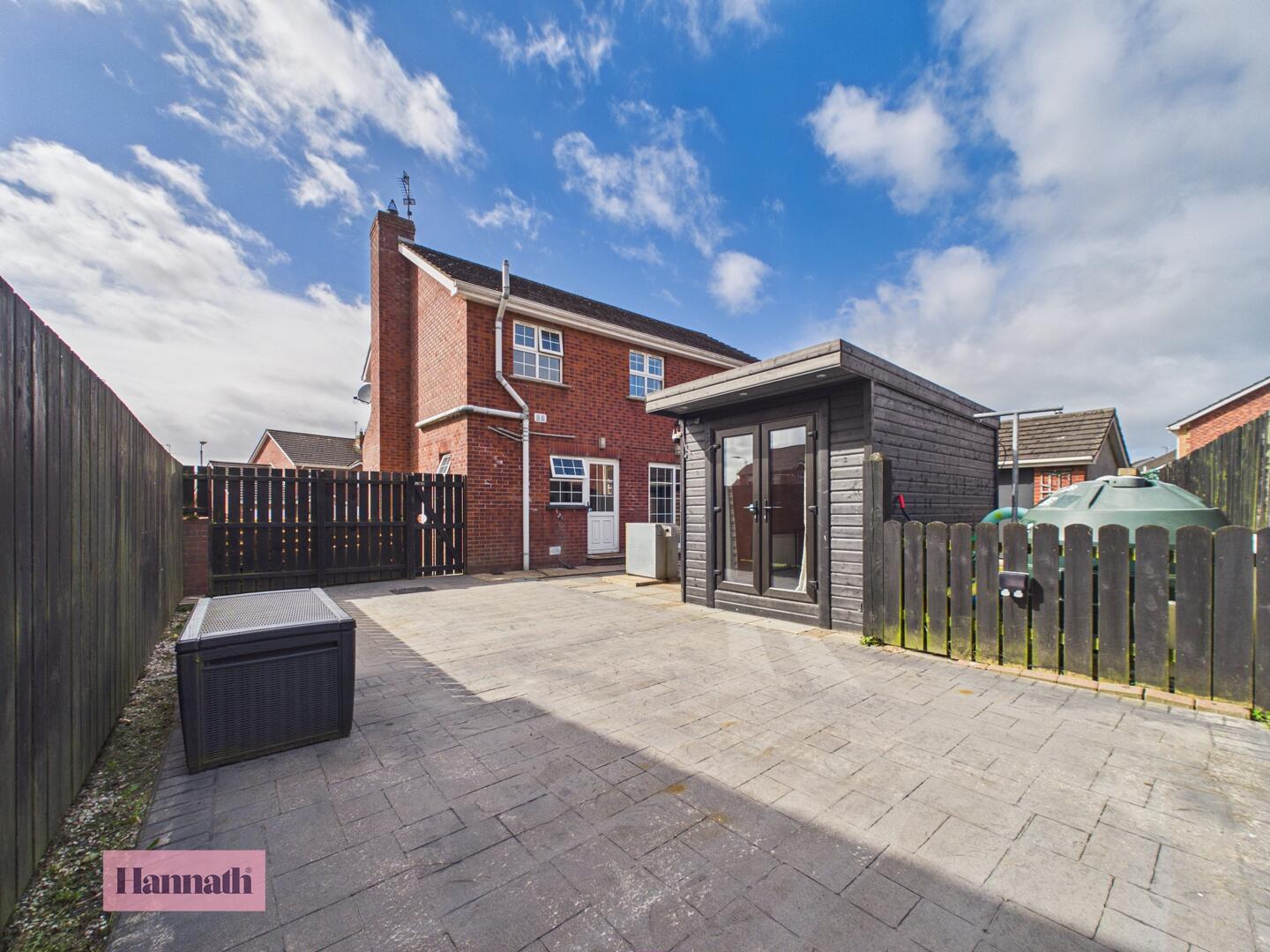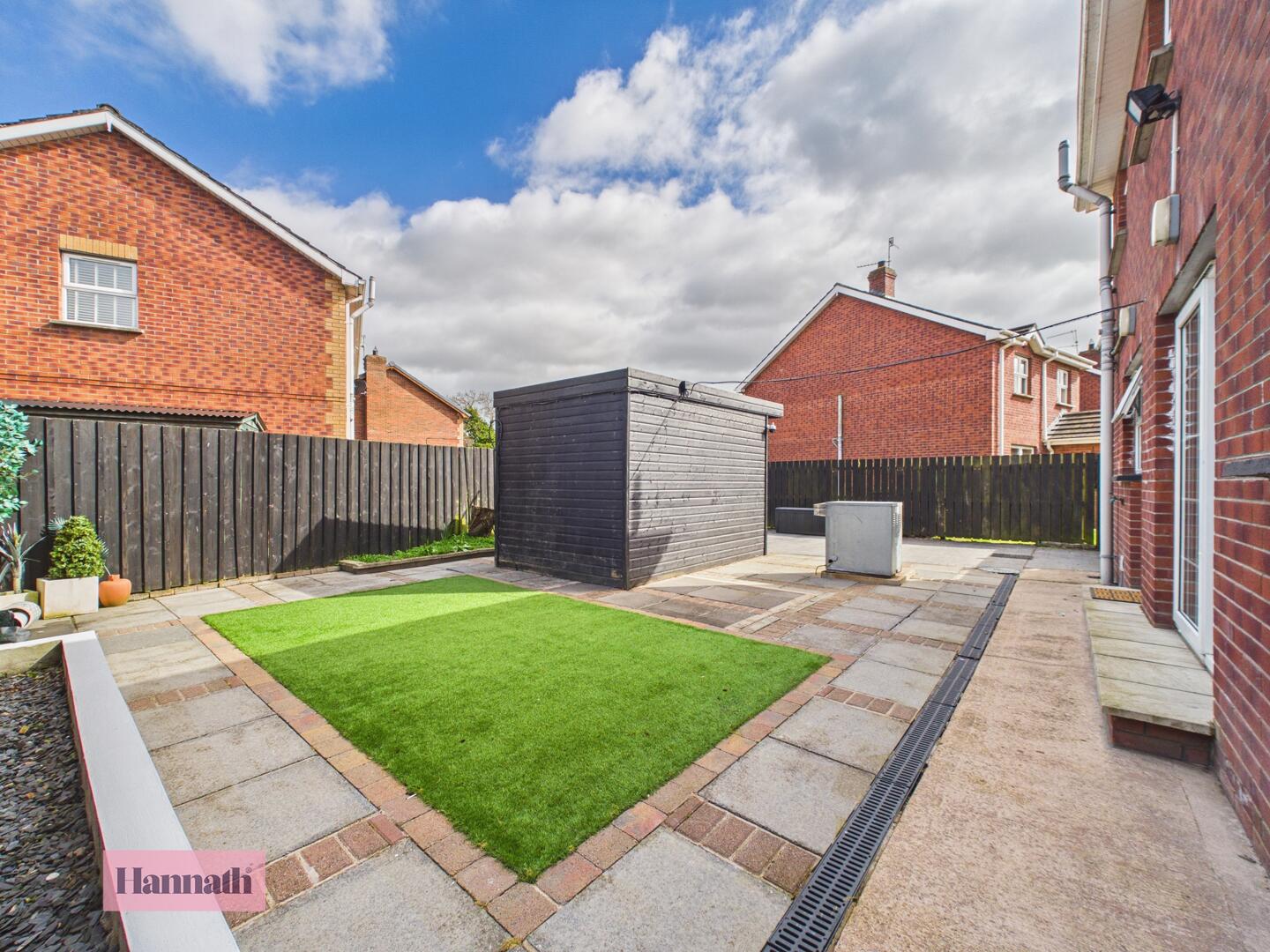 The rear garden features a low-maintenance design with a mix of paved patios and an artificial grass lawn, ideal for relaxing or entertaining. It is enclosed by dark fencing for privacy, with a sizeable shed and the garden office providing useful outdoor storage and workspace.