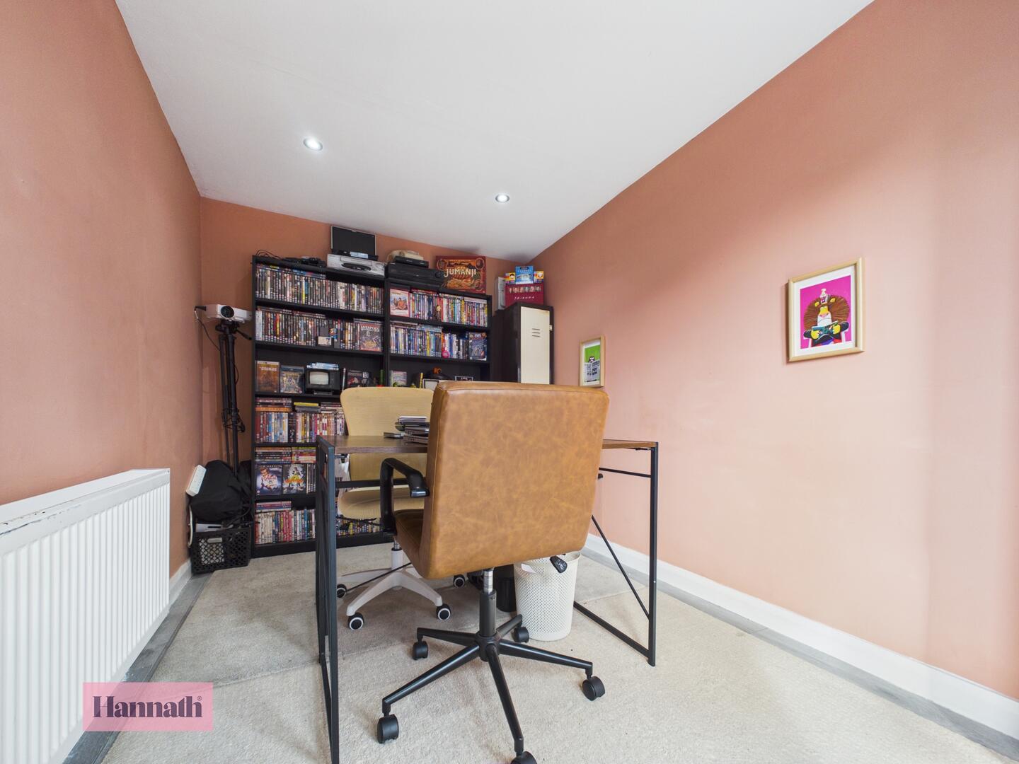 This room is currently used as a study, featuring calming terracotta walls and neutral carpeted flooring. It includes patio doors that open to the garden, allowing natural light to flood the space, making it an ideal home office.