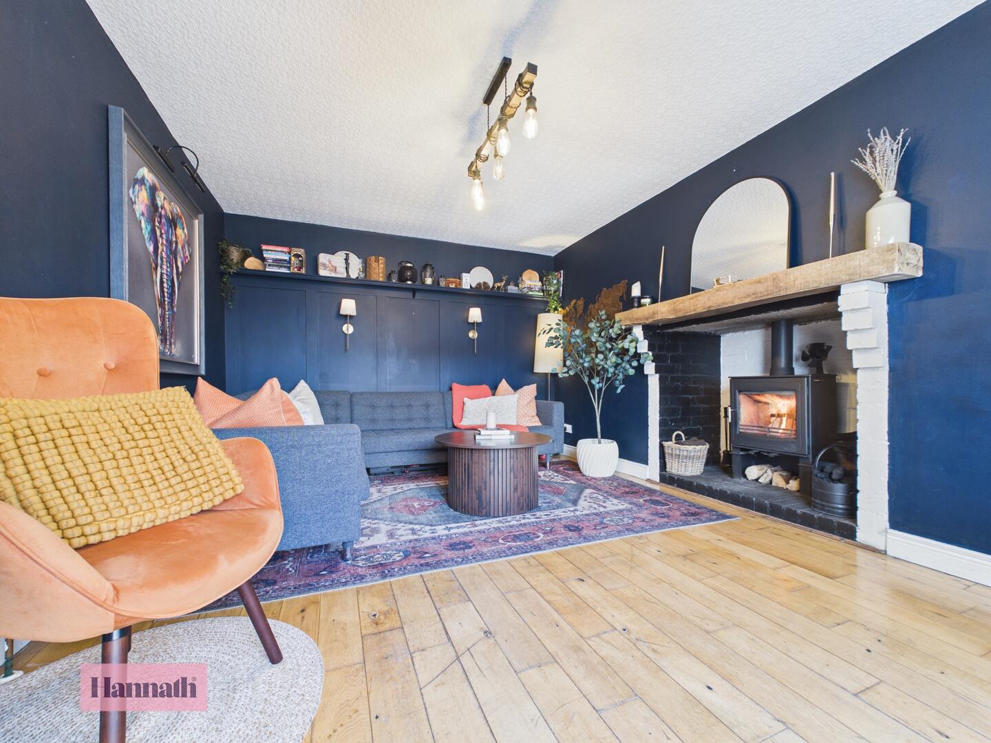 This living room offers a cosy atmosphere with dark painted walls providing a striking contrast to the light wood flooring. A large window at the front of the house floods the room with natural light. The focal point is a wood-burning stove set within a brick fireplace, creating a warm and inviting space for relaxation.