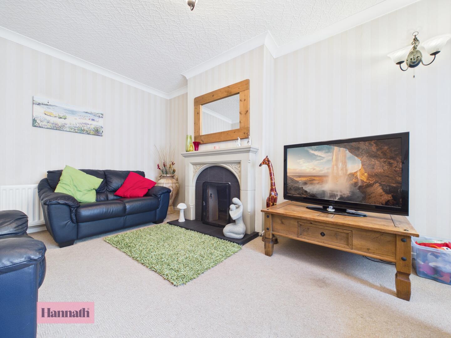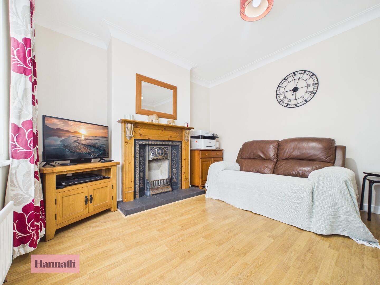 Spacious and bright, the second reception room offers a welcoming atmosphere with neutral carpeting and a decorative fireplace as a focal point. Large windows overlook the rear, allowing natural light to pour in and fill the room, making it an ideal space for family gatherings or quiet evenings.