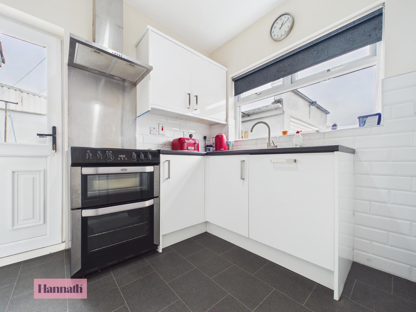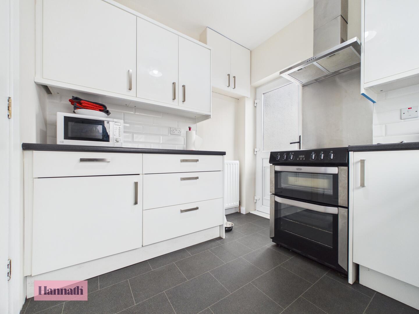 The kitchen is finished with modern white cabinets, creating a clean and functional cooking space. There is a built in dishwasher and a space for oven and fridge freezer.