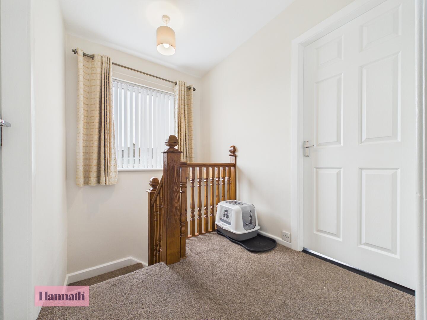 The landing connects the three bedrooms and family bathroom, offering a neutral carpeted floor and natural light from a window to the side, creating a calm and practical space.