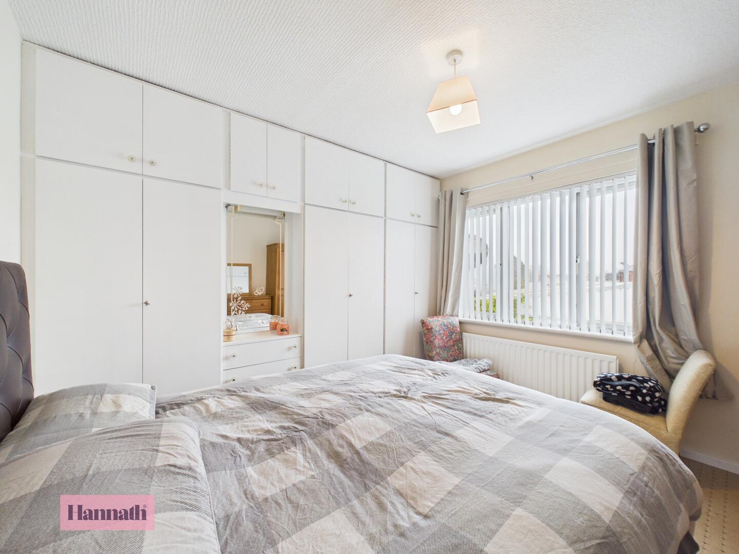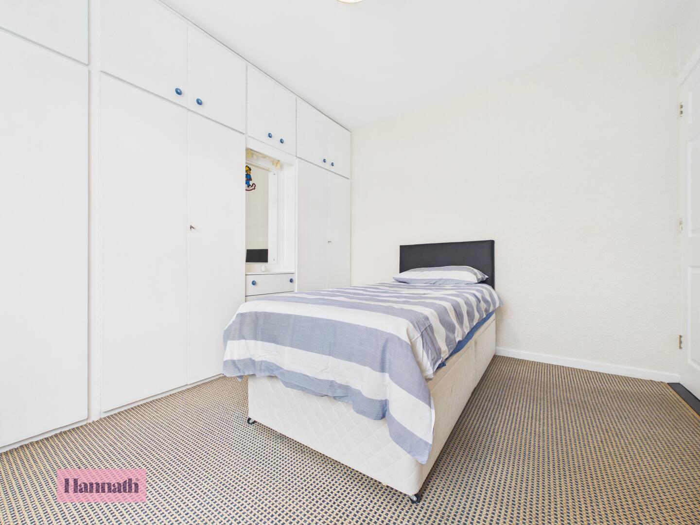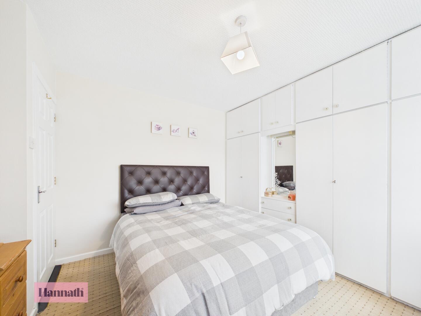 Bedroom 2 is a smaller room with neutral carpeting and a window overlooking the side. Built-in wardrobes offer useful storage, making this a versatile room suitable for a variety of needs.