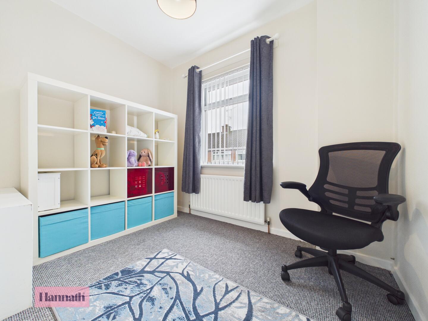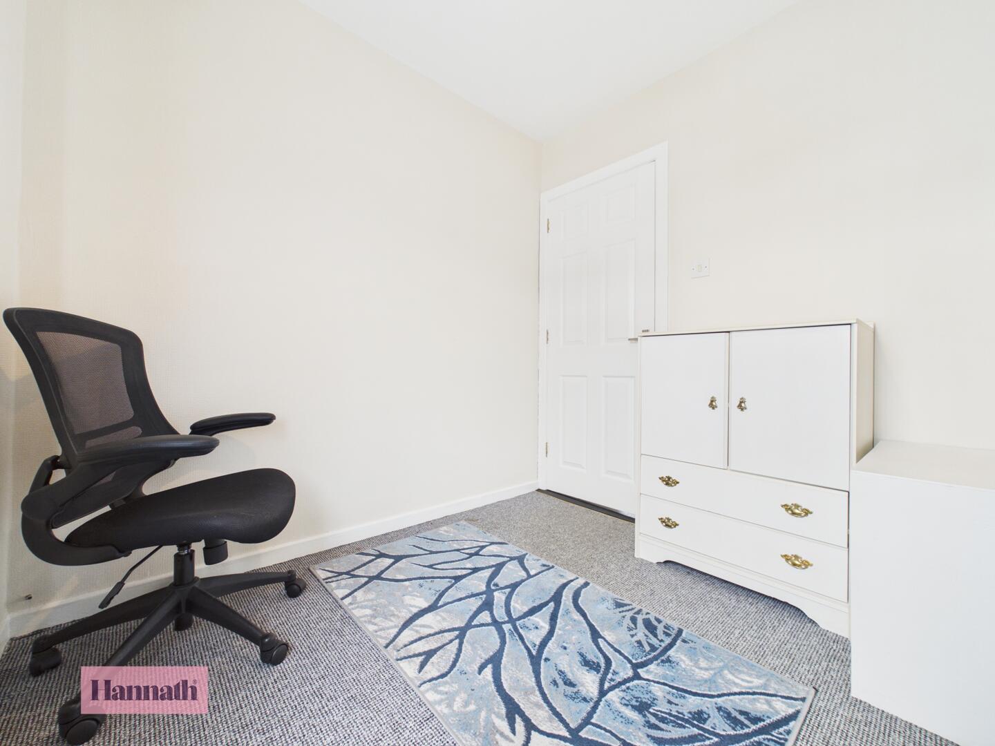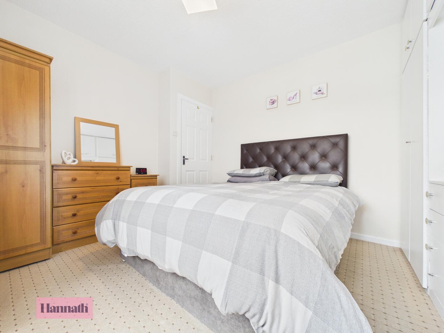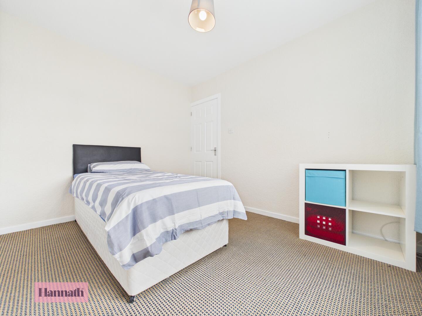 Bedroom 2 is a smaller room with neutral carpeting and a window overlooking the side. Built-in wardrobes offer useful storage, making this a versatile room suitable for a variety of needs.