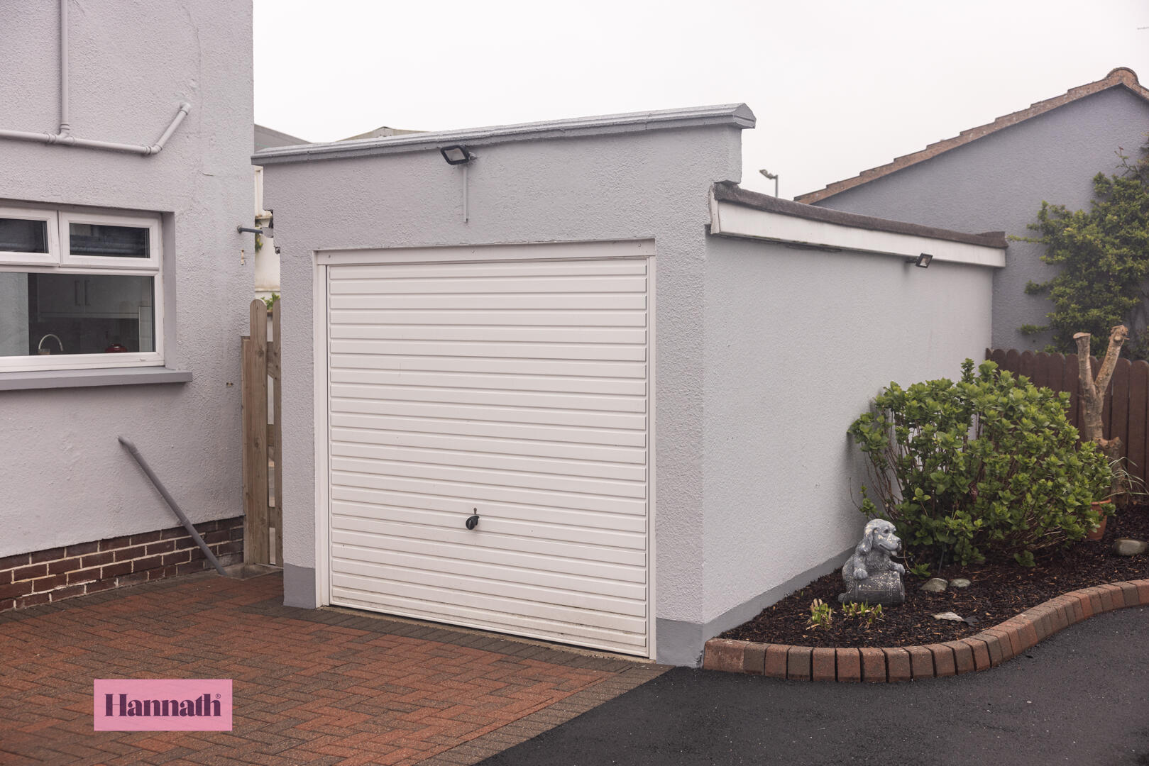 The garage is accessed to the side of the property. It is a detached structure that provides additional storage or parking space.