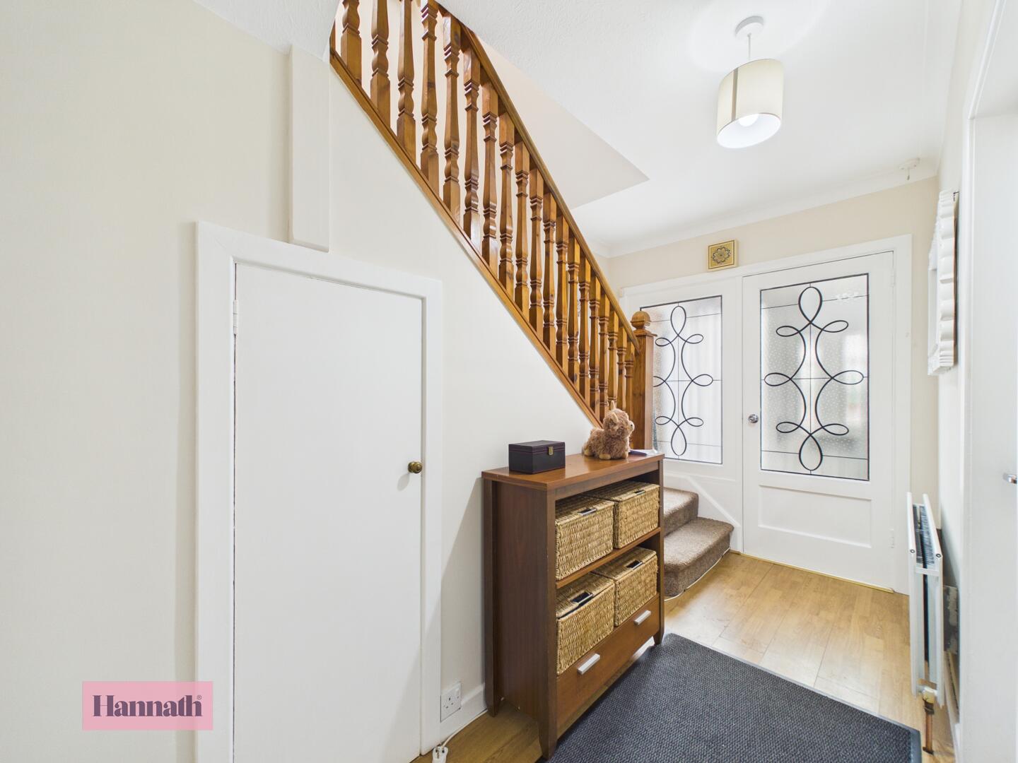 The entrance hall welcomes you with its bright and airy feel, featuring a wood laminate flooring and a white front door with decorative glazing. The space leads naturally into the main hallway, which is finished with wood-effect flooring and offers access to the staircase and adjoining rooms. A built-in storage cupboard is cleverly tucked under the staircase, adding practical storage options.