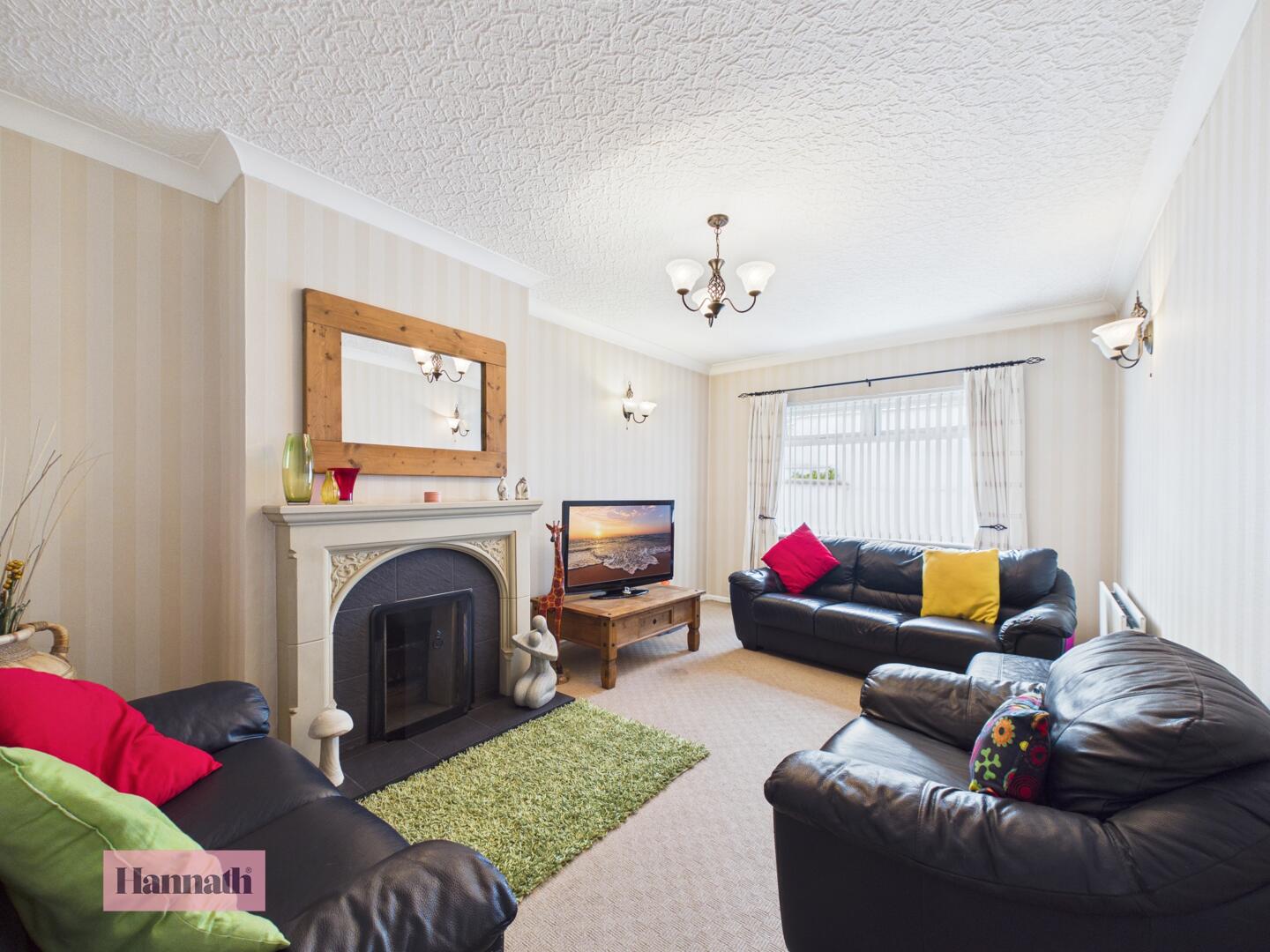 This cosy living room provides a warm and inviting space, with wood-effect flooring and a focal fireplace set within a wooden surround. A large window allows plenty of natural light to fill the room, creating a bright and comfortable environment for relaxing or entertaining.