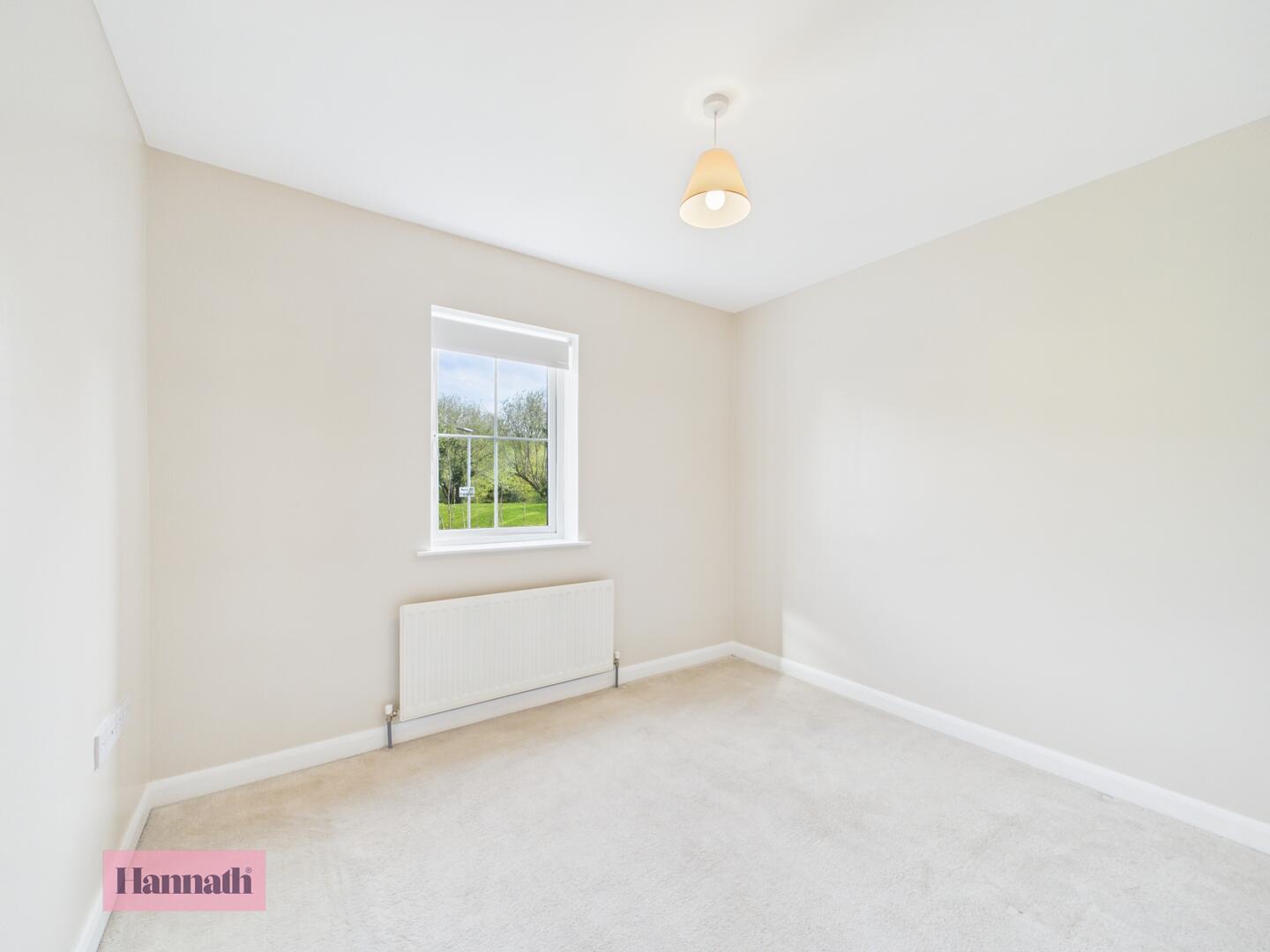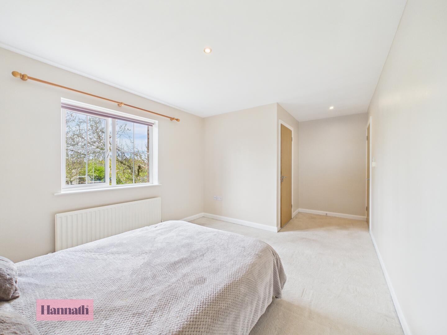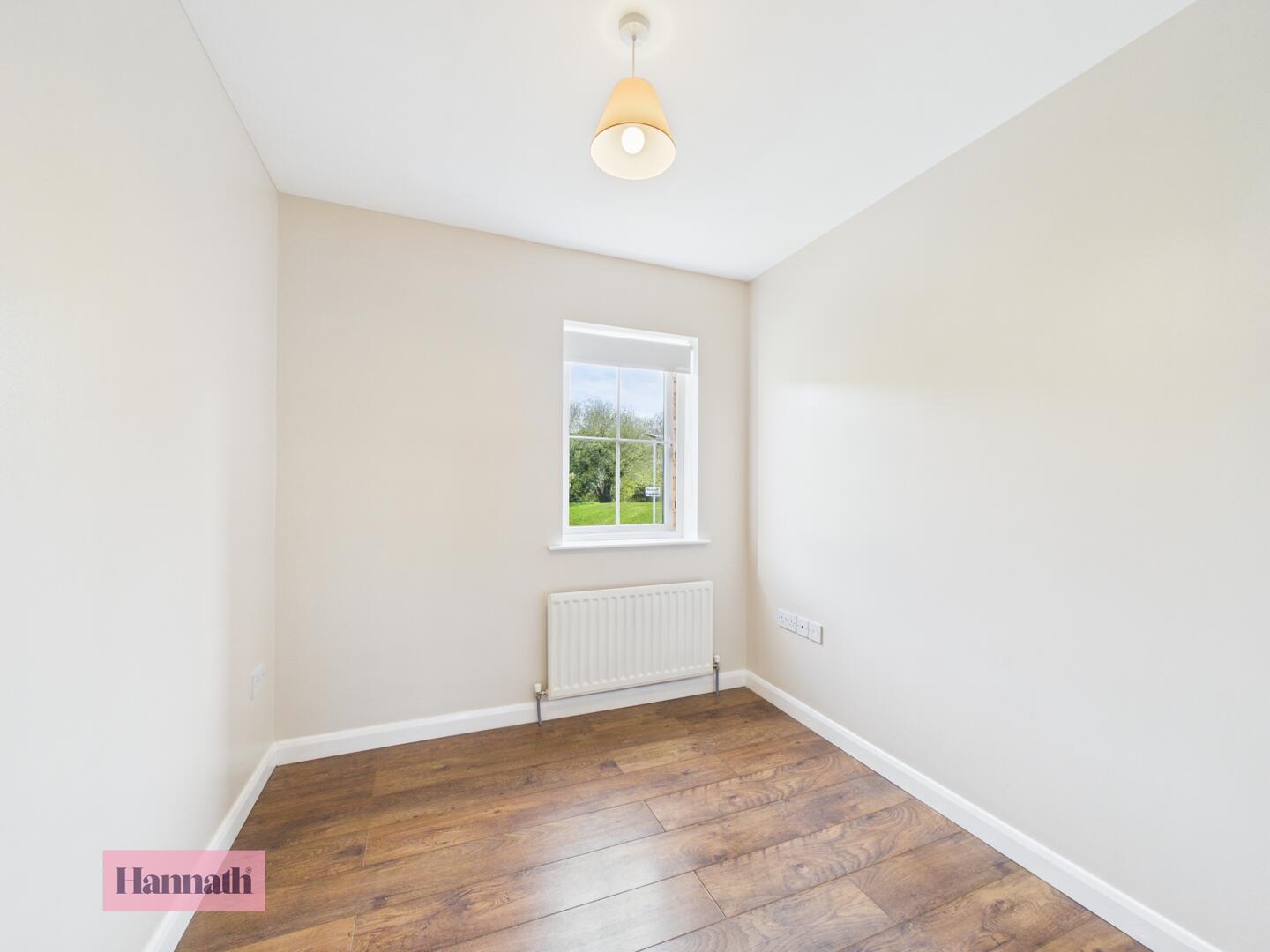 This bedroom is a bright, compact space with wood-effect flooring and neutral walls. A centrally positioned window ensures a good level of natural light.