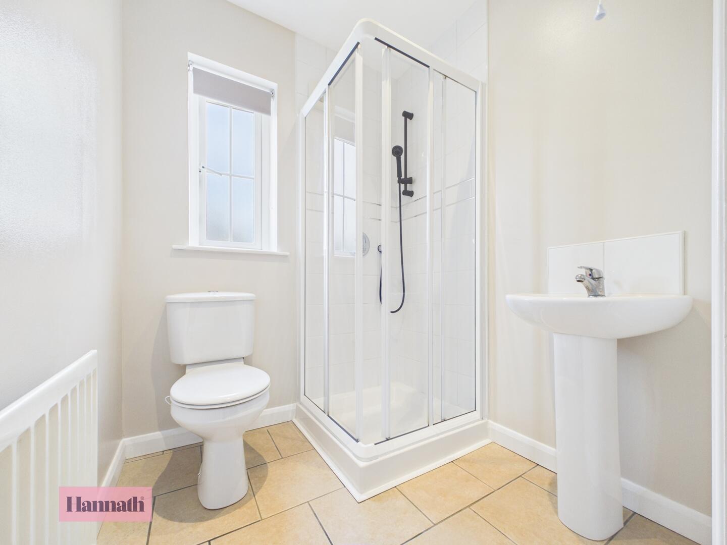 This en-suite bathroom is fitted with a shower cubicle, basin, and toilet. Light walls and a window provide a bright and airy feel.