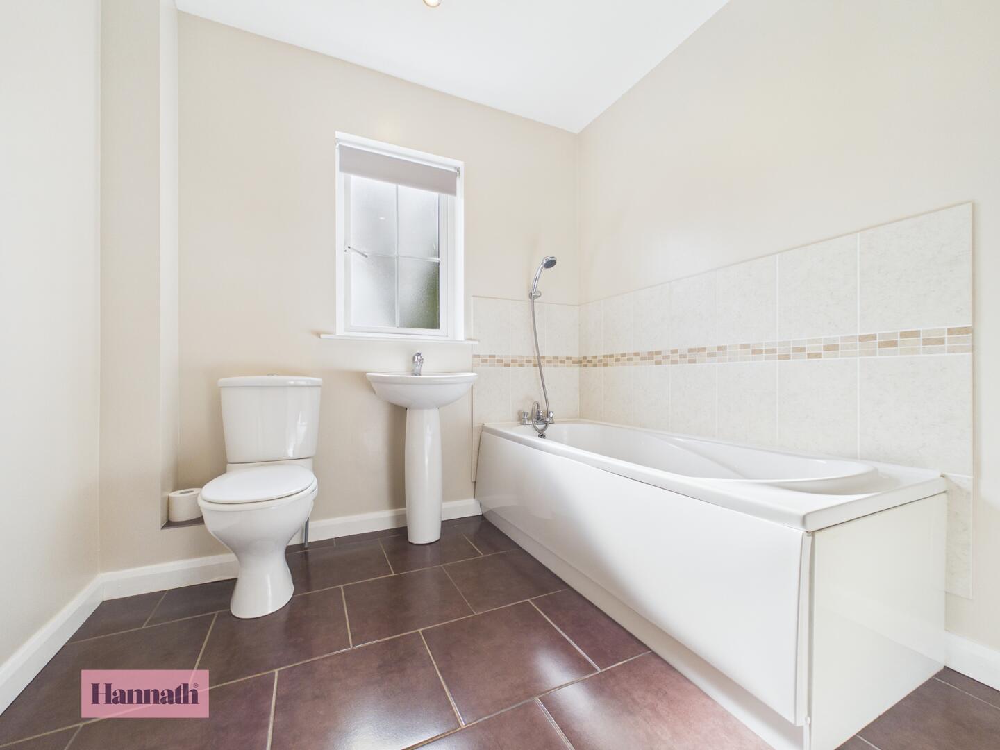 The main bathroom features a white suite with a bathtub, basin, and toilet. Dark tiled flooring contrasts with pale walls, and a window allows natural light to enter.