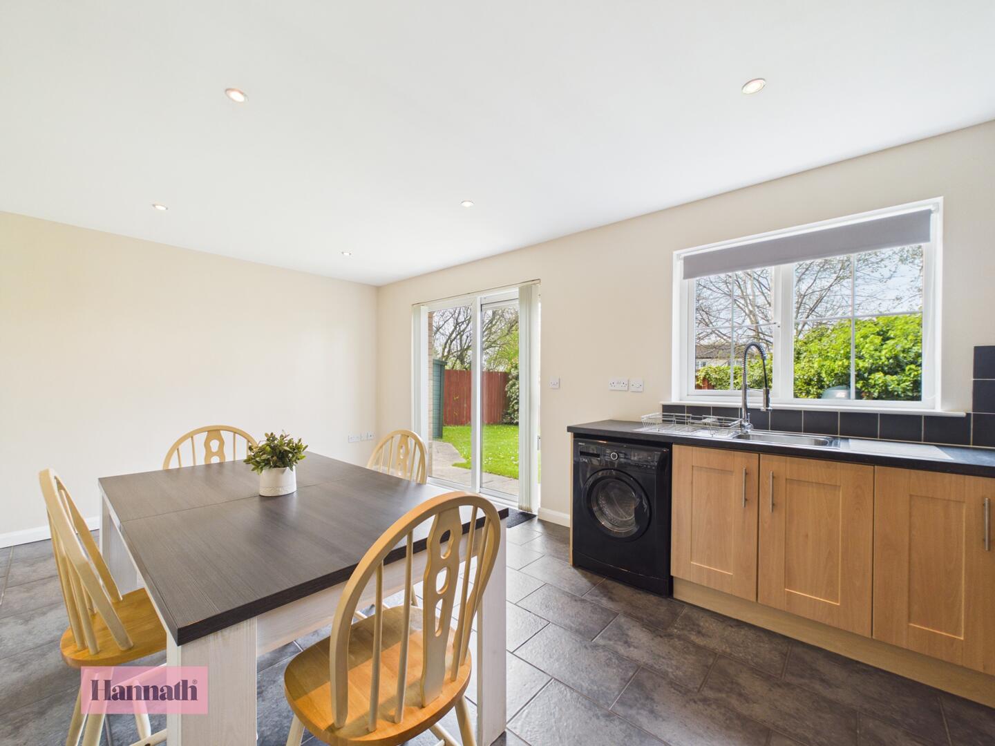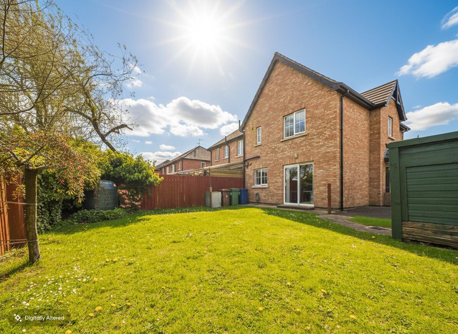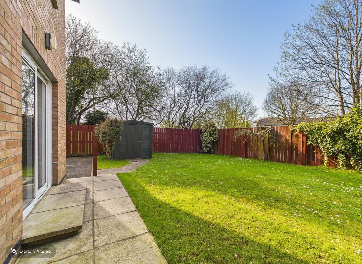 A good-sized, enclosed rear garden with a lawn bordered by a wooden fence and mature trees and shrubs, providing privacy and a peaceful outdoor space. A paved patio area just outside the kitchen provides an ideal spot for outdoor dining.