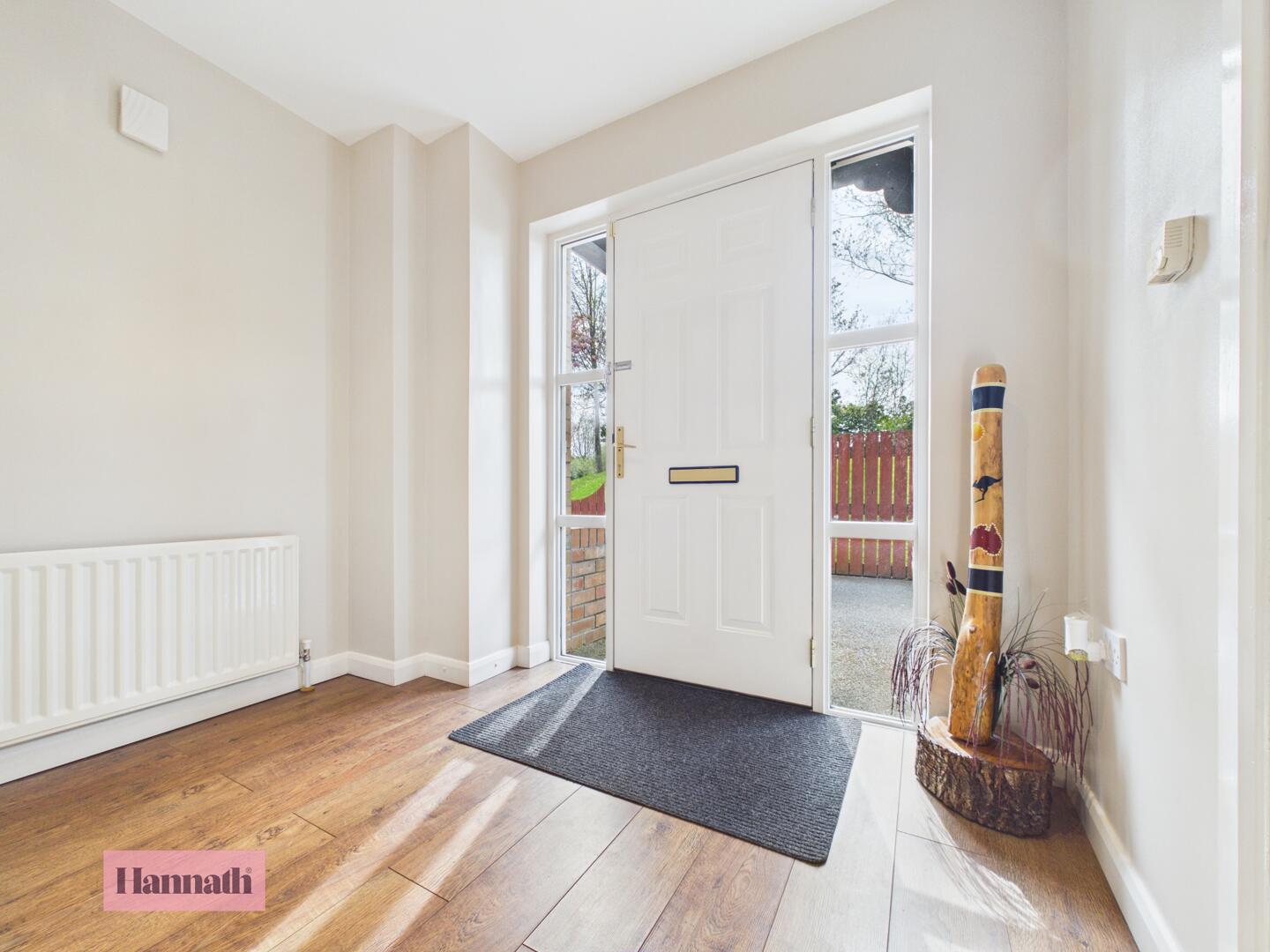 This welcoming hallway features a bright entrance door complemented by windows on either side, allowing natural light to fill the space.