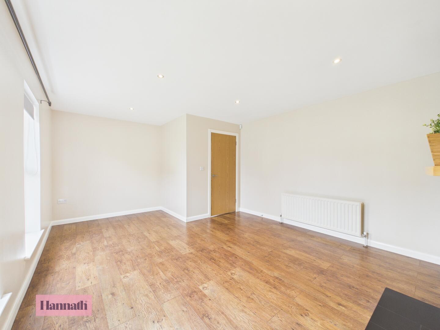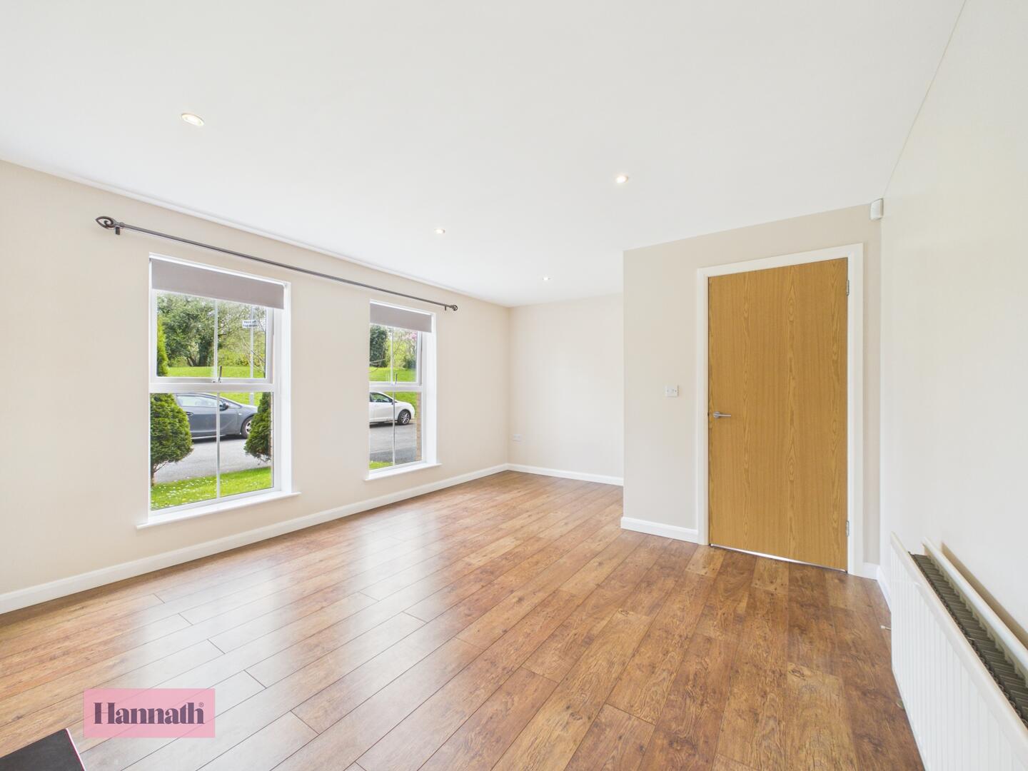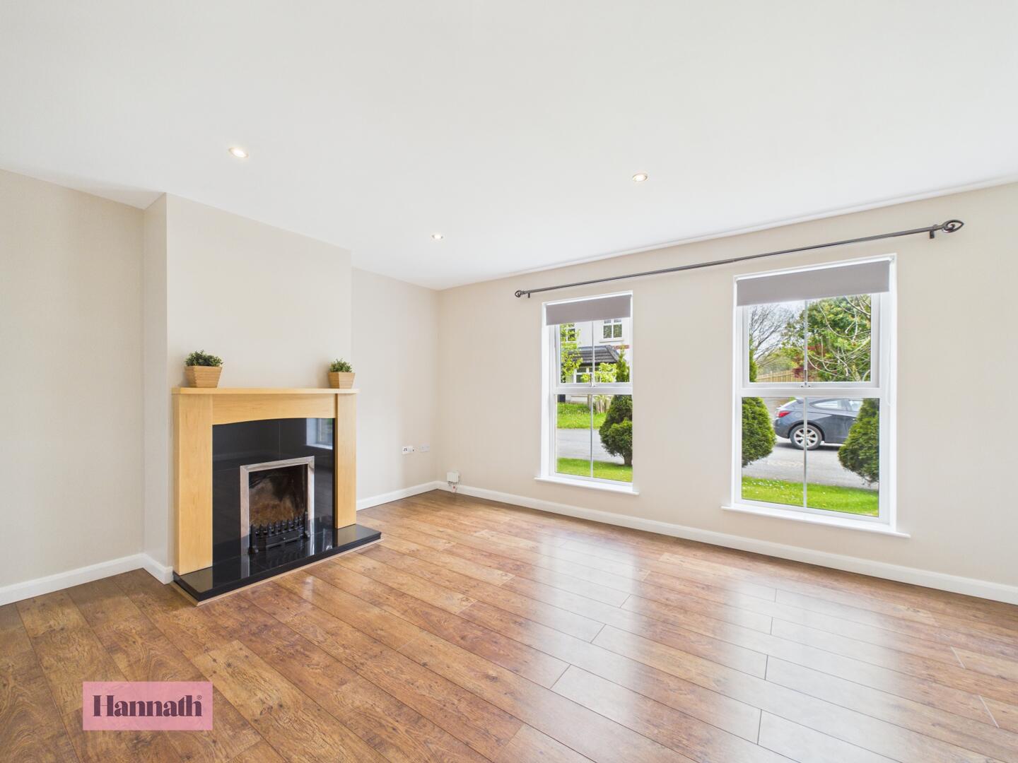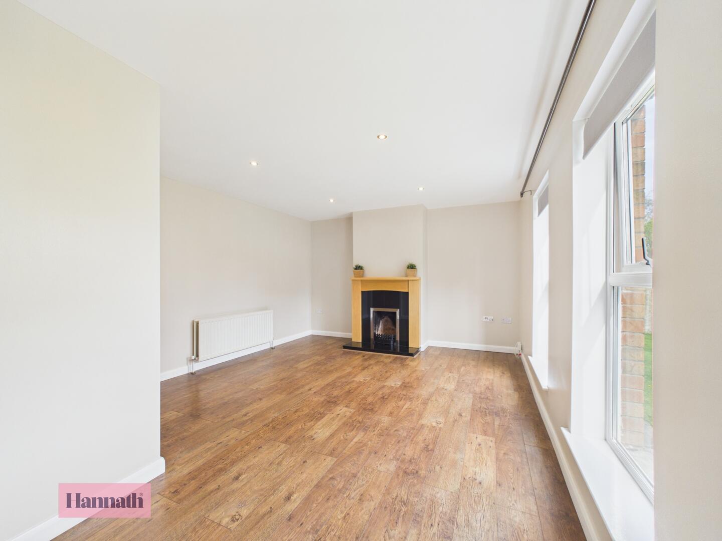 A spacious lounge offering plenty of natural light from two large double windows with views out to the front garden. The room is characterised by clean, neutral walls and warm wood flooring that runs throughout. A central fireplace with a modest wooden surround provides a cosy focal point, while recessed ceiling lights enhance the room's brightness.