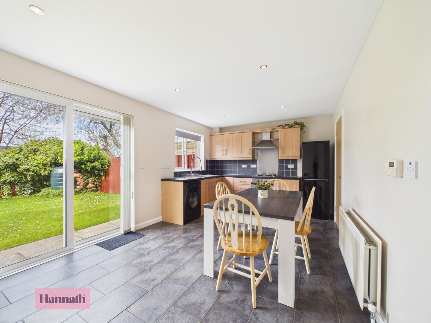 This kitchen and dining area combines functionality with a bright, airy atmosphere. It features light wood cabinetry with black countertops and a tiled floor in dark grey tones, providing a practical and stylish workspace. A window above the sink and the sliding doors allow plenty of natural light to flood in.