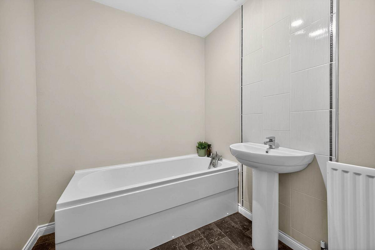 Bath with mixer tap and shower attachment; pedestal wash hand basin with mixer tap; low flush w.c.; and shower cubicle.