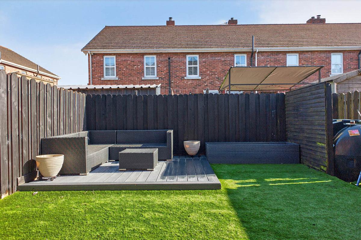 Enclosed rear garden with artificial grass and decked patio. Paved path. Tap. Light. Timber fence surround.
