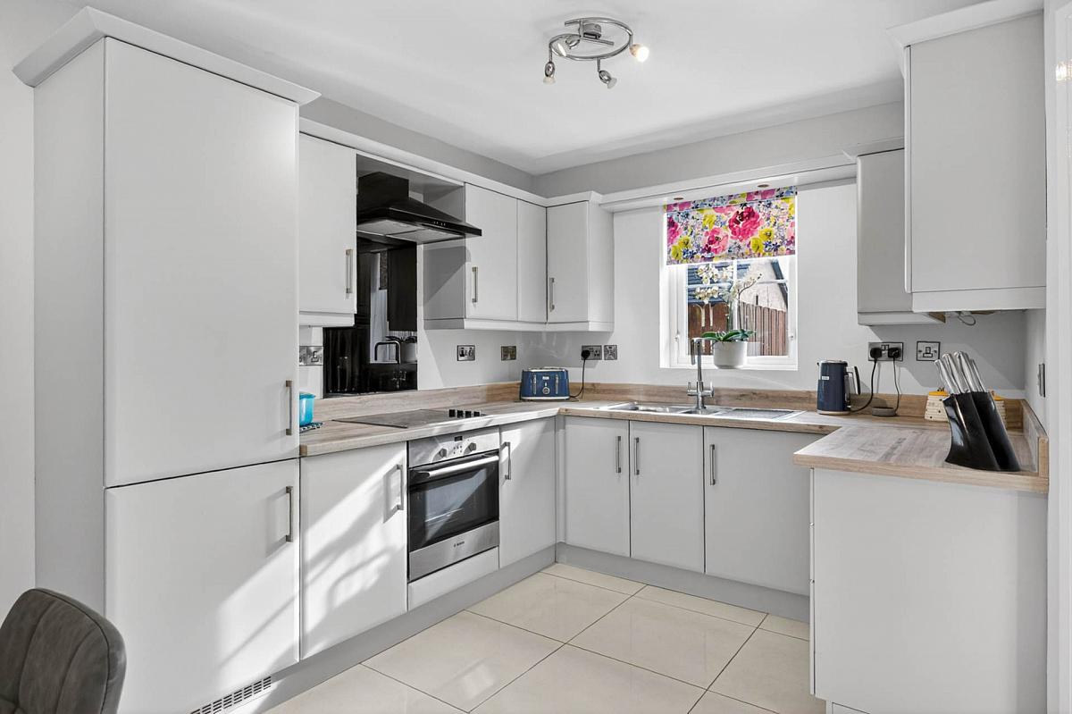 Range of high and low level units. Large and small bowl single drainer stainless steel sink unit with mixer tap. Built-in oven, 4 ring ceramic hob and extractor unit over. Integrated fridge freezer. Understairs storage. Tiled floor.