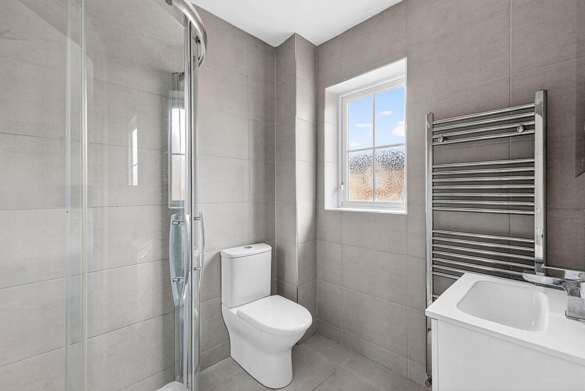 to include corner shower cubicle with drench head shower and separate shower attachment; vanity wash hand basin with mixer tap; low flush w.c. Heated towel rail. Fully tiled walls and tiled floor.