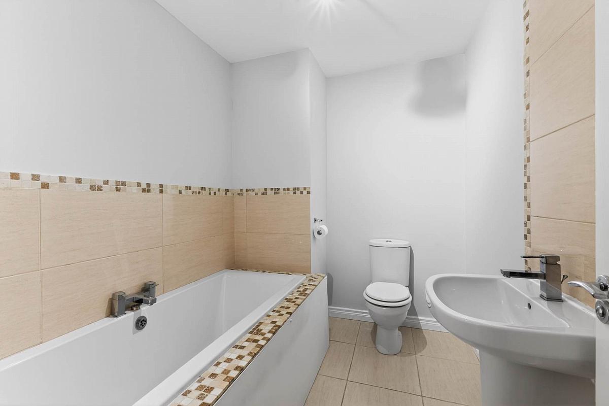 White to include panelled bath with centred mixer tap; floating wash hand basin with mixer tap; low flush w.c. Part tiled walls. Tiled floor.